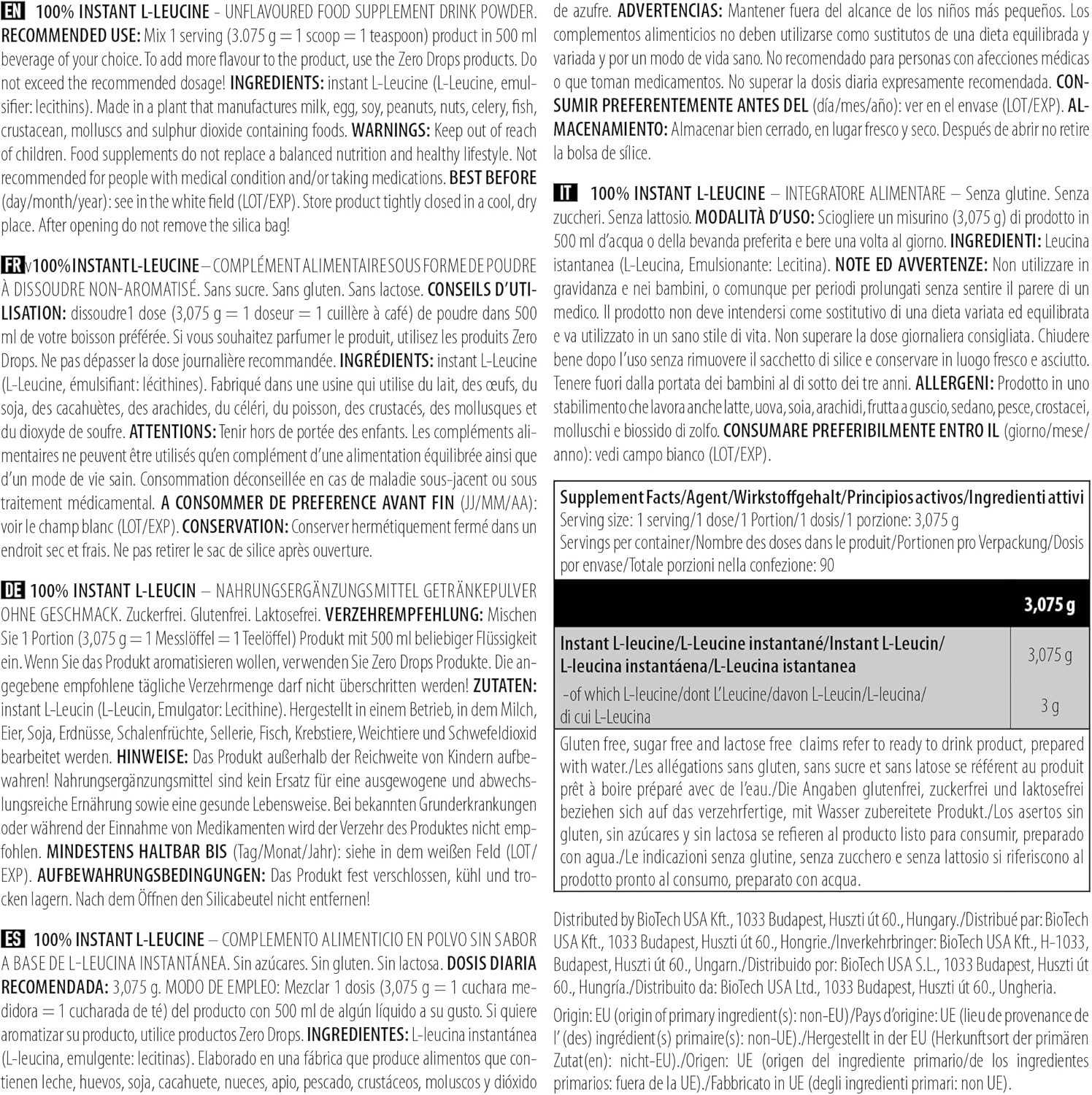 Mix 1 serving (3 g = 1 scoop) of BioTechUSA 100% Instant L-Leucine with 300 ml of water or juice.