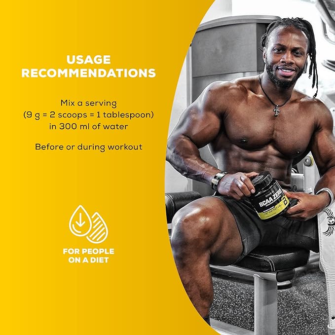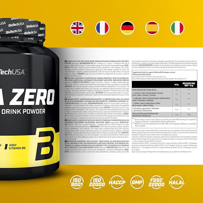 Mix 1 serving (9 g = 2 scoops) of BioTechUSA BCAA Zero with 300 ml of cold water. Shake well until fully dissolved and consume before, during, or after workouts. On non-training days, take one serving between meals for balanced amino acid support.