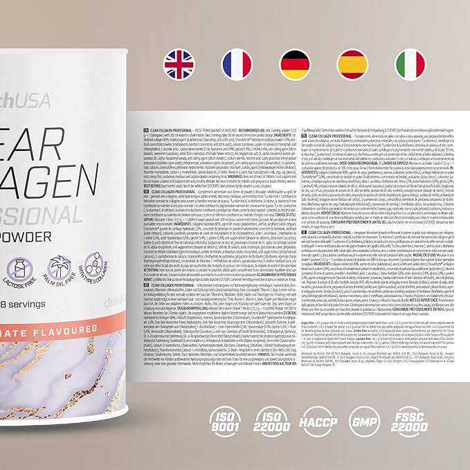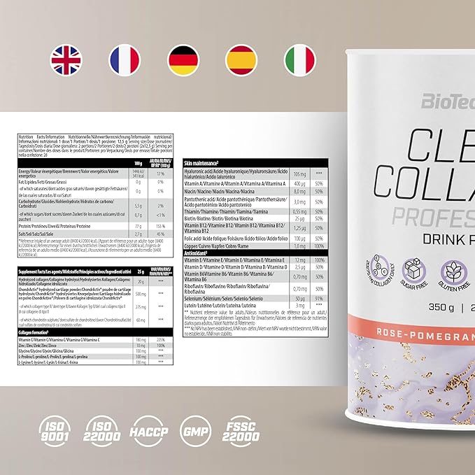Biotechusa Clear Collagen Professional, Flavoured Drink Powder Containing Hydrolysed Collagen, Hyaluronic Acid, Amino Acids, Vitamins, Minerals, 350 G, Rose & Pomegranate