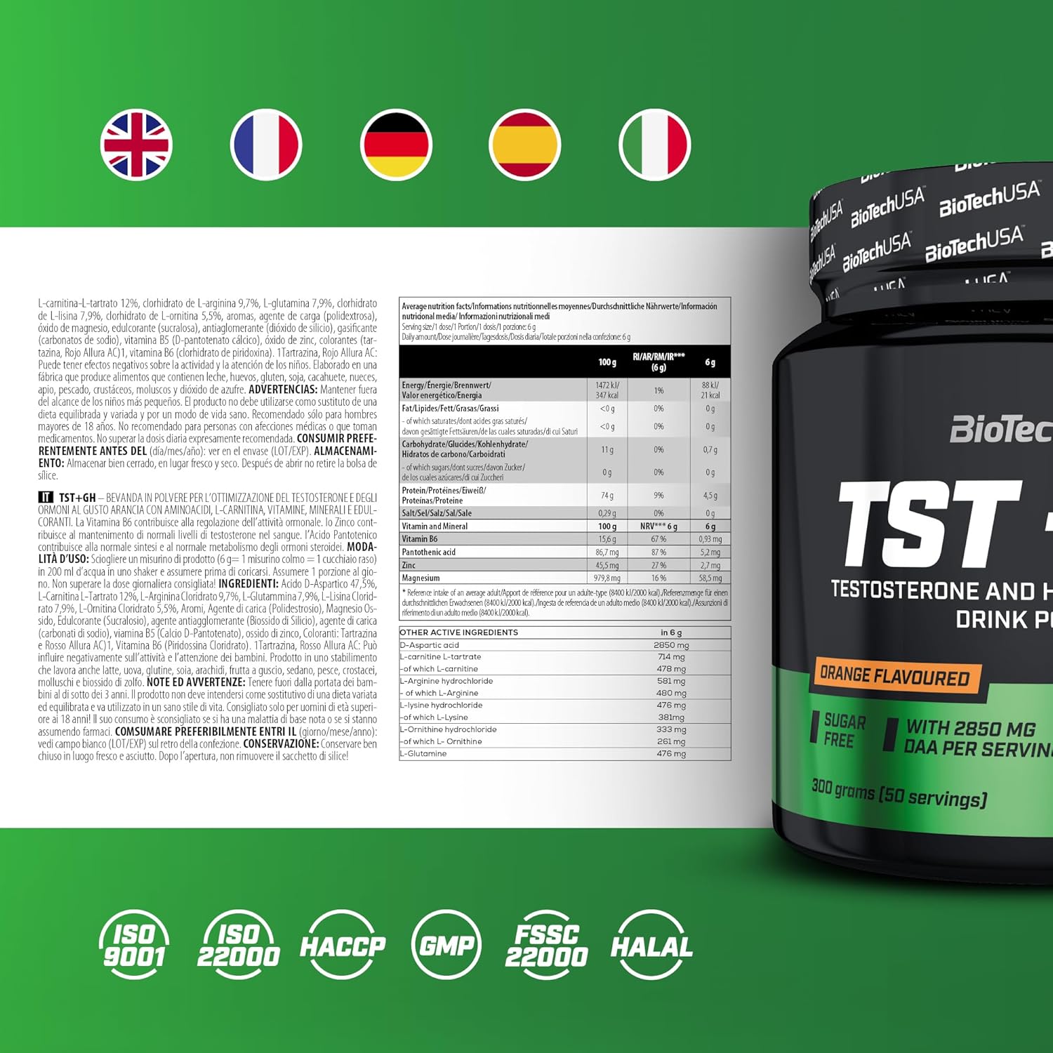 Biotechusa Tst + Gh | Testosterone & Hormone Boosting Drink Powder | 2,850Mg Daa | Amino Acids, Vitamins, Minerals | Sugar-, Lactose- And Gluten-Free | 300G | Orange