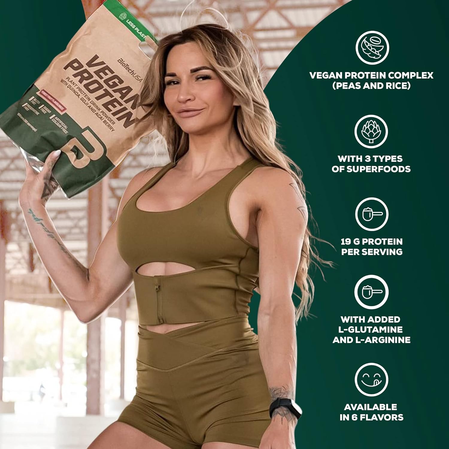 BioTechUSA Vegan Protein combines rice and pea protein isolates to create a complete amino acid profile comparable to whey β supporting effective muscle recovery and growth.