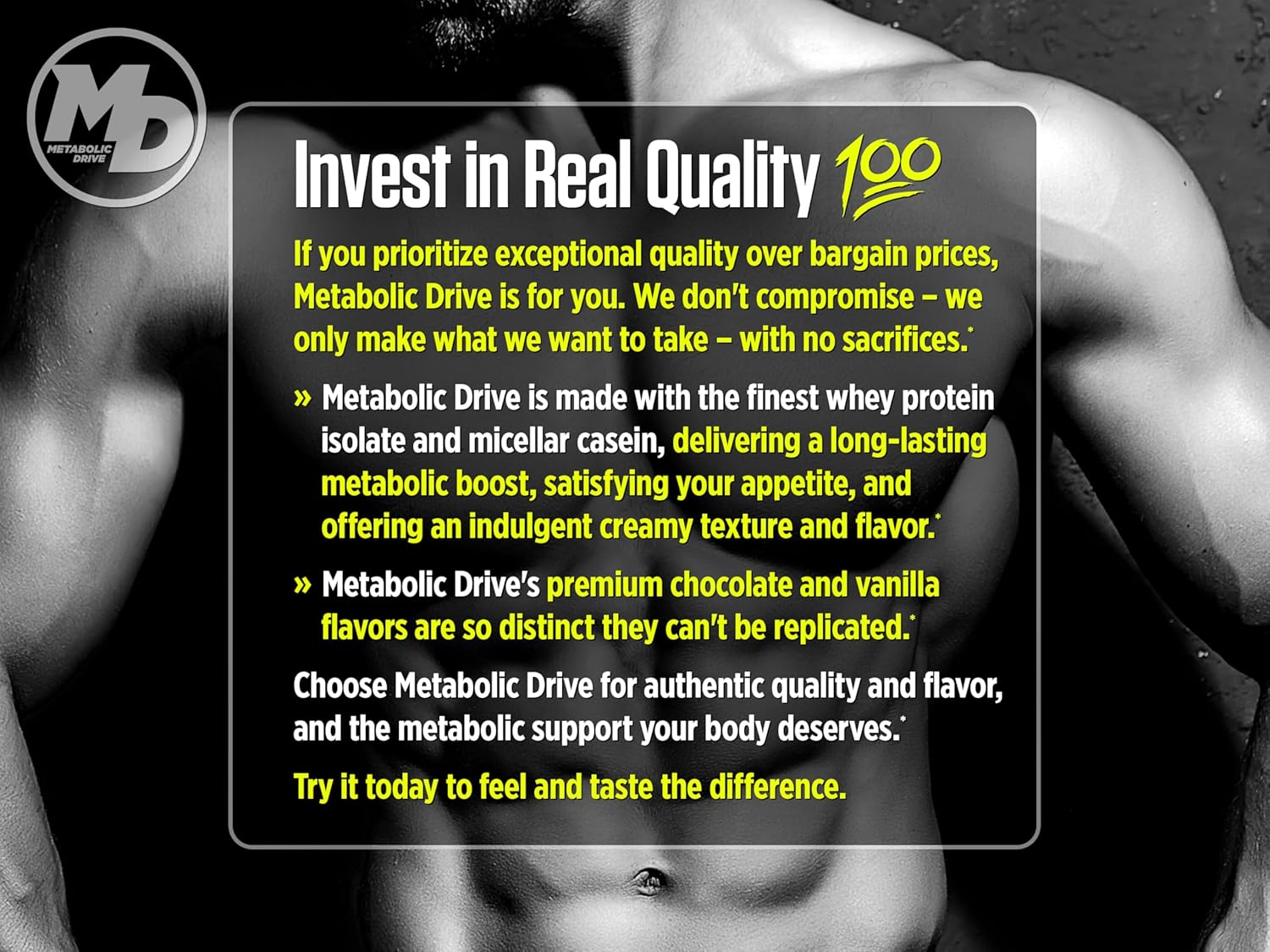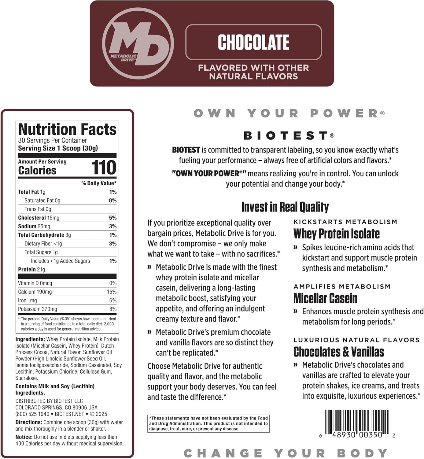 About this item If exceptional quality matters more to you than bargain prices, Metabolic Drive is your protein. We don't compromise β we craft precisely what we use ourselves, without shortcuts or sacrifices. While others choose cheap ingredients or flashy marketing, we let Metabolic Drive speak for itself.* Made in the USA. Metabolic Drive features premium whey protein isolate and micellar casein, designed to deliver sustained metabolic enhancement, lasting satiety, and indulgent creamy flavor and texture β Serving Size: 30g (1 Scoop).* Whey Protein Isolate: Loaded with leucine, whey isolate rapidly boosts muscle protein synthesis and metabolism. (Tipton, 2004; Tang, 2009; Boirie, 1997; West, 2011; Pennings, 2012)* Micellar Casein: Supplies a slow, continuous release of amino acids, sustaining muscle protein synthesis and promoting metabolic health. (Boirie, 1997; Dangin, 2002; Tipton, 2001; Reitelseder, 2011)* Exquisite Natural Flavors: Our signature chocolate and vanilla flavors are so uniquely exceptional that even industry-leading flavor experts can't duplicate them β and they've certainly tried.* Biotest Formulations β For Those Who Know. See more product details,If exceptional quality matters more to you than bargain prices, Metabolic Drive is your protein. We don't compromise β we craft precisely what we use ourselves, without shortcuts or sacrifices. While others choose cheap ingredients or flashy marketing, we let Metabolic Drive speak for itself.* Made in the USA,Metabolic Drive features premium whey protein isolate and micellar casein, designed to deliver sustained metabolic enhancement, lasting satiety, and indulgent creamy flavor and texture β Serving Size: 30g (1 Scoop),Whey Protein Isolate: Loaded with leucine, whey isolate rapidly boosts muscle protein synthesis and metabolism. (Tipton, 2004; Tang, 2009; Boirie, 1997; West, 2011; Pennings, 2012),Micellar Casein: Supplies a slow, continuous release of amino acids, sustaining muscle protein synthesis and promoting metabolic health. (Boirie, 1997; Dangin, 2002; Tipton, 2001; Reitelseder, 2011),Exquisite Natural Flavors: Our signature chocolate and vanilla flavors are so uniquely exceptional that even industry-leading flavor experts can't duplicate them β and they've certainly tried,Biotest Formulations β For Those Who Know