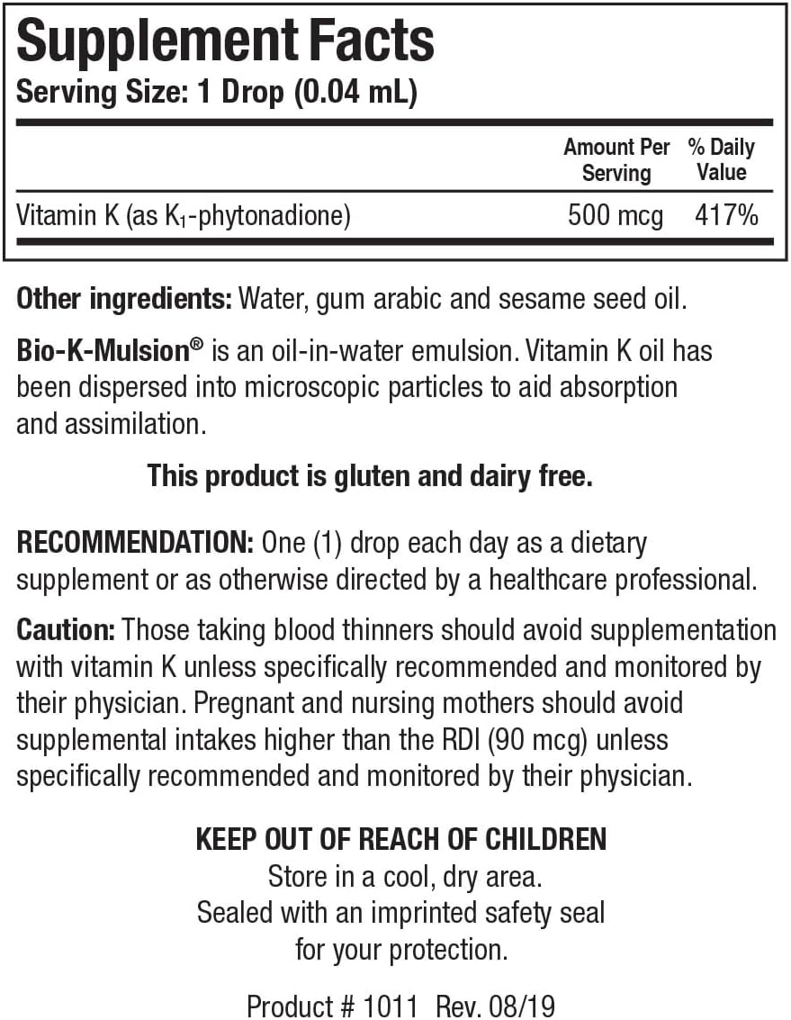 Biotics Research Bio K Mulsion Strong Bones, Heart Health, Blood Clotting Support, Liquid Vitamin K, K1 Phytonadione, 1 Fl Oz