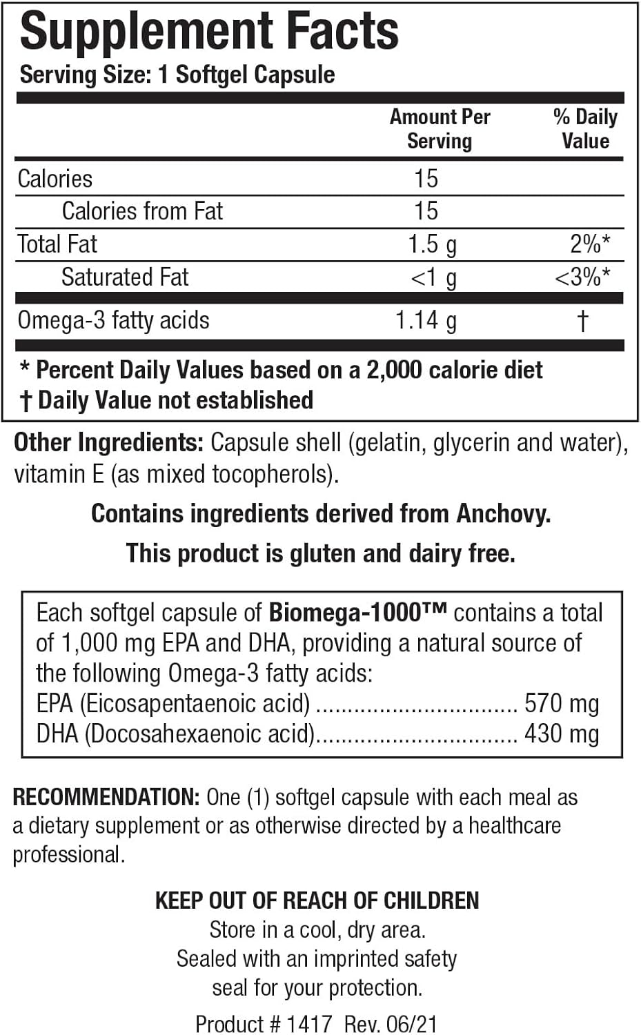 Good For Your Heart: Mounting Research Links Fish Consumption To Cardiovascular Health, Due To The Benefits Found In Omega-3 Essential Fatty Acids (Efas); One Biomega-1000 Capsule Delivers A Potent 1 Gram Dose Of The Efas Epa/Dha, Giving You A Concentrated Form Of These Heart-Healthy Nutrients