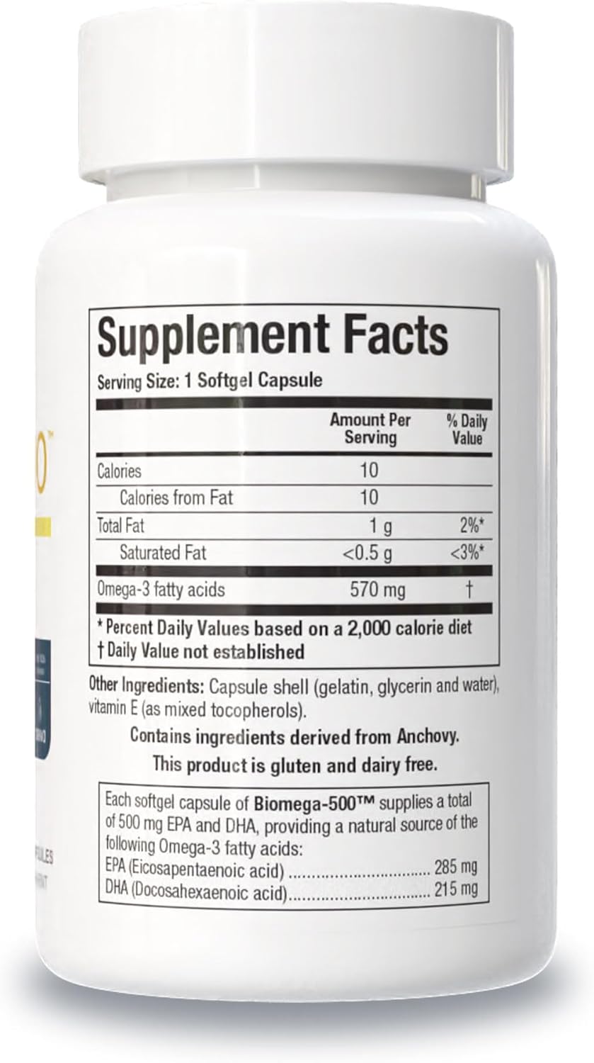 GOOD FOR YOUR HEART: Mounting research links fish consumption to cardiovascular health, due to the benefits found in omega-3 essential fatty acids (EFAs); One Biomega-500 capsule delivers a potent 500mg dose of the EFAs EPA/DHA, giving you a concentrated form of these heart-healthy nutrients
