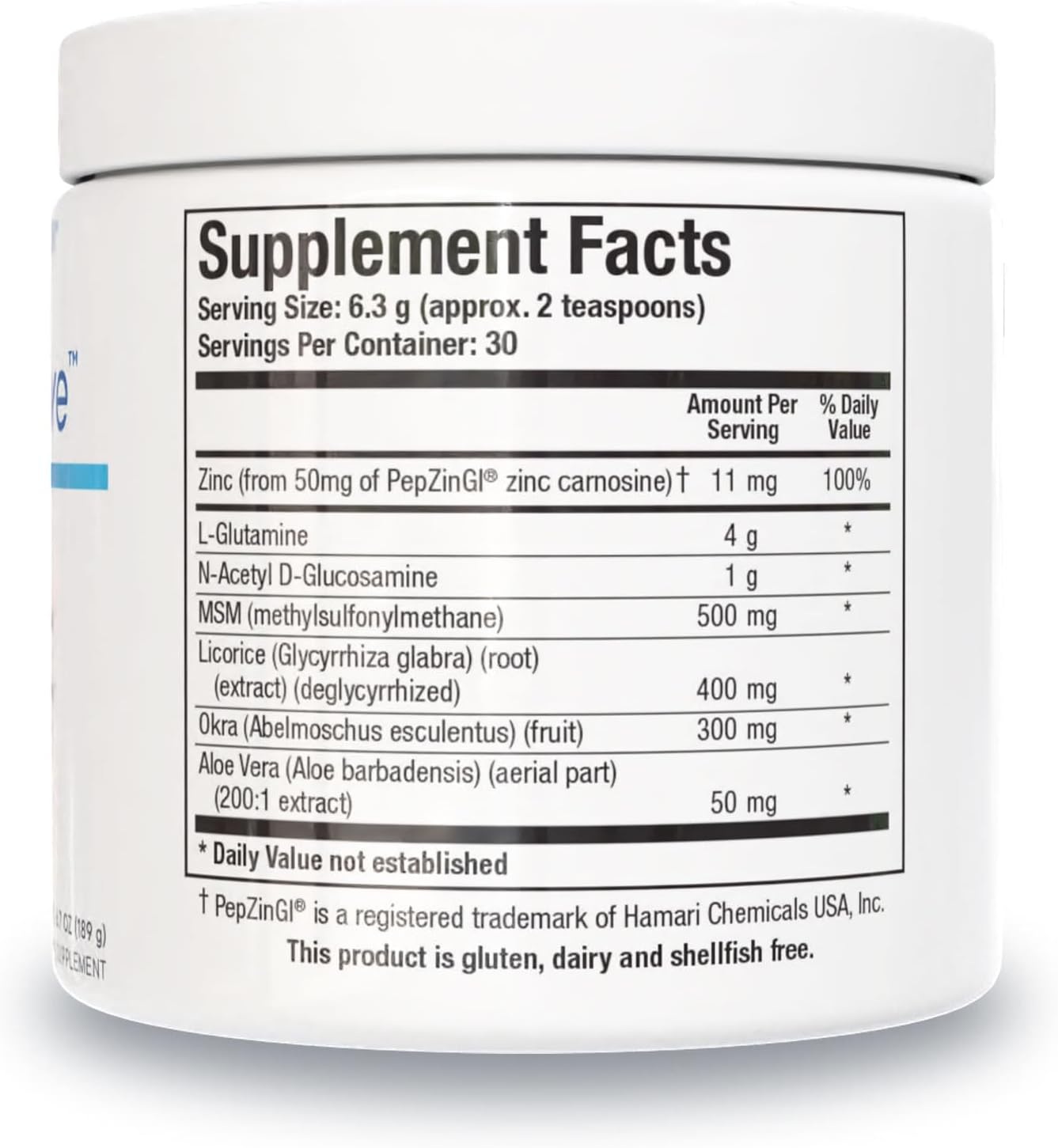REJUVENATES HEALTH OF INTESTINAL MUCOSA: GI-Resolve combines a number of gut-supportive nutrients such as L-Glutamine, Zinc Carnosine, N-Acetyl Glucosamine, MSM, Aloe vera leaf, Okra, and DGL, that revive the health of the intestinal mucosa and also support the natural secretions of the mucous membranes in the GI tract