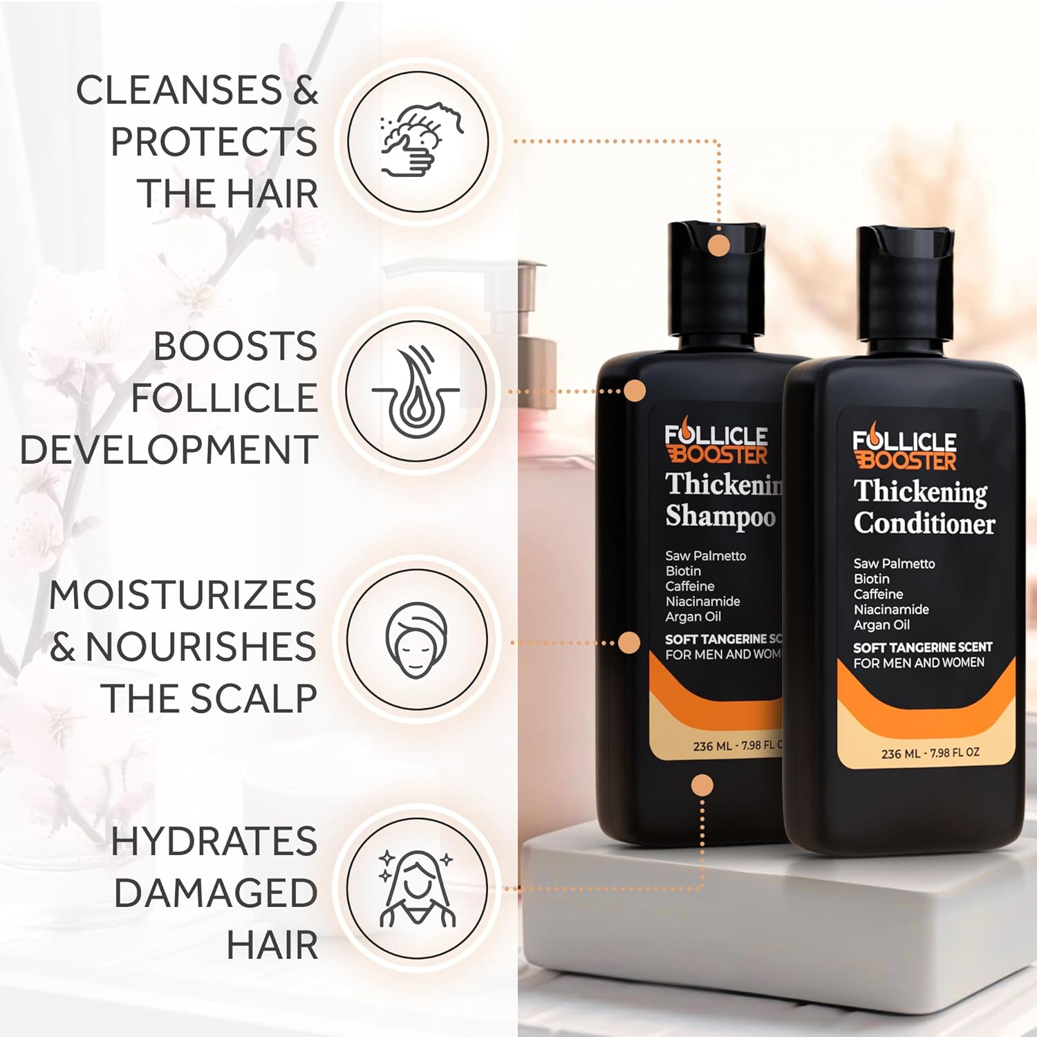 About this item Hair Regrowth Ingredients - Thickening shampoo and conditioner infused with Caffeine, Niacinamide, Argan, Biotin, Jojoba, Coconut, Zinc, Ginseng, and many more. Anti-Thinning Kit for Hair Growth with Benefits - Removing everyday dirt from your scalp while nourishing and boosting your follicles. Best mens shampoo for constant use. Suitable for All Hair Types - Specially formulated to perfectly fit everyone, this set will be your best friend in the shower. A pleasant and soft tangerine scent that you will absolutely love. Shampoo and Conditioner Set for Dry Scalp Care - Our biotin with saw palmetto and zinc set features essential oils to help improve your scalp appearance with great-smelling hair that nourishes the entire hair shaft. Volumizing Set - Our biotin with coconut, and argan oil is specially formulated to enhance the way your hair looks by moisturizing it to appear fuller and hydrated. See more product details,Hair Regrowth Ingredients - Thickening shampoo and conditioner infused with Caffeine, Niacinamide, Argan, Biotin, Jojoba, Coconut, Zinc, Ginseng, and many more,Anti-Thinning Kit for Hair Growth with Benefits - Removing everyday dirt from your scalp while nourishing and boosting your follicles. Best mens shampoo for constant use,Suitable for All Hair Types - Specially formulated to perfectly fit everyone, this set will be your best friend in the shower. A pleasant and soft tangerine scent that you will absolutely love,Shampoo and Conditioner Set for Dry Scalp Care - Our biotin with saw palmetto and zinc set features essential oils to help improve your scalp appearance with great-smelling hair that nourishes the entire hair shaft,Volumizing Set - Our biotin with coconut, and argan oil is specially formulated to enhance the way your hair looks by moisturizing it to appear fuller and hydrated