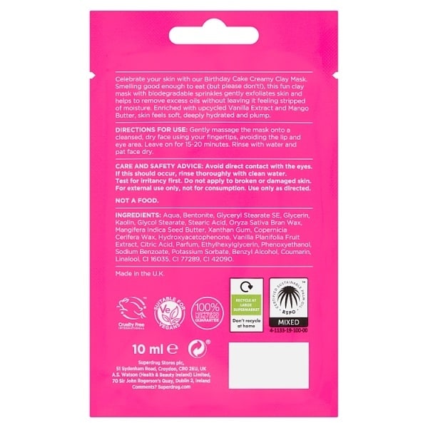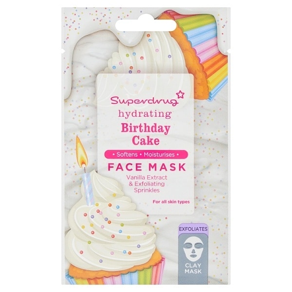 Product Information:Superdrug Birthday Cake Face Mask,Features:Softens, Moisturises,Warning Or Restrictions:For External And Adult Use Only. Keep Out Of Reach Of Children. Use As Directed. Not For Use On Irritated Or Broken Skin. We Recommend Testing A Small Quantity Of Mask Behind The Ear Prior To Use – If Sensitivity Occurs, Do Not Use. Avoid Contact With Eyes, If Product Gets Into Eyes Rinse Well With Clean Water,Product Specification:Aqua, Bentonite, Glyceryl Stearate Se, Glycerin, Kaolin, Glycol Stearate, Stearic Acid, Oryza Sativa Bran Wax, Mangifera Indica Seed Butter, Xanthan Gum, Copernicia Cerifera Wax, Hydroxyacetophenone, Vanilla Planifolia Fruit Extract, Citric Acid, Parfum, Ethylhexylglycerin, Phenoxyethanol, Sodium Benzoate, Potassium Sorbate, Benzyl Alcohol, Coumarin, Linalool, Ci 16035, Ci 77289, Ci 42090,Product Uses:Simply Cleanse Your Face With Warm Water And Pat Dry. Apply The Mask With Your Fingertips. Leave For 15 Minutes Or Until Completely Dry, Then Rinse Off With Warm Water And Gently Pat Dry. Dispose Of The Packaging Responsibly
