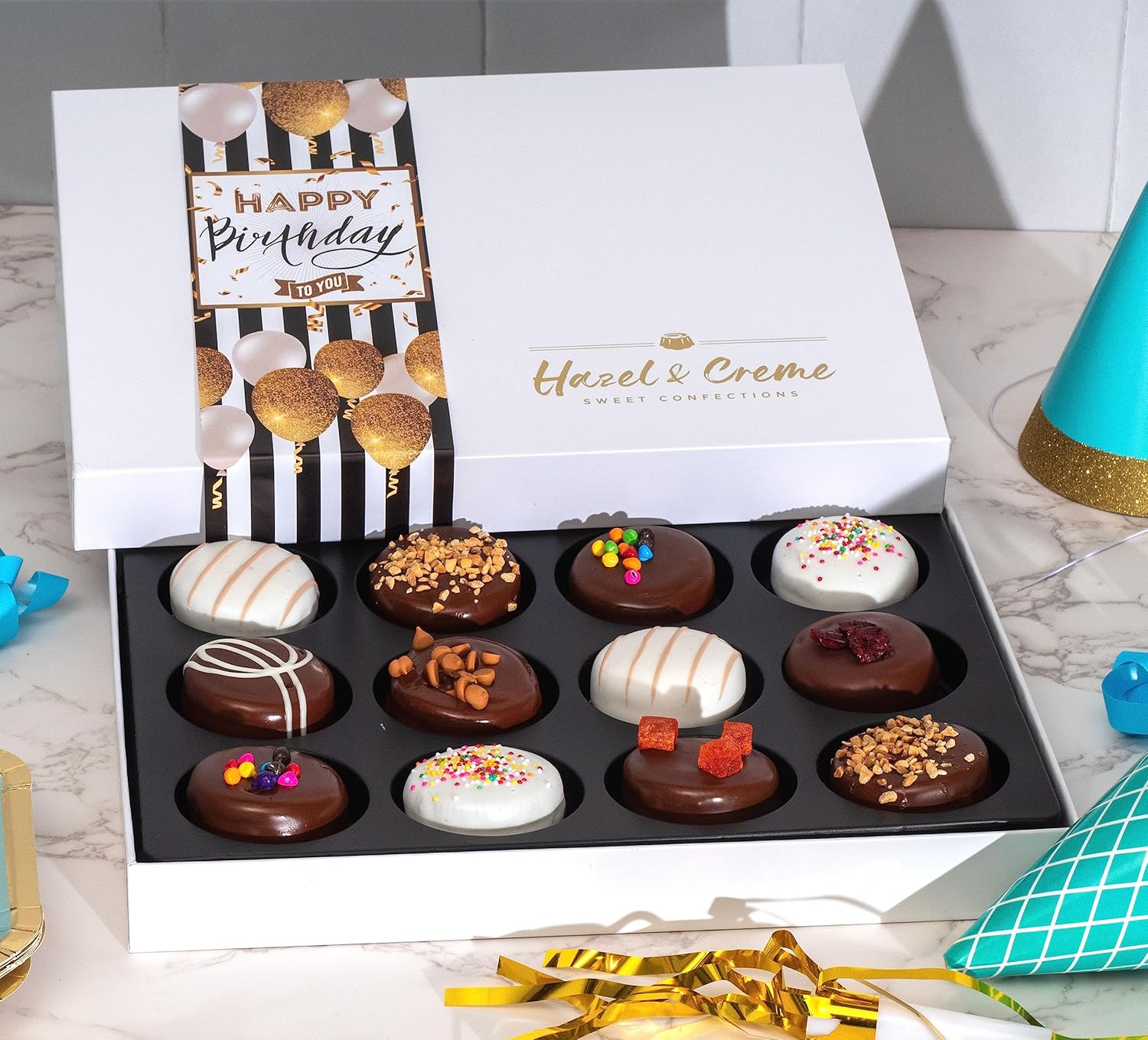 Ready To Gift: Give The Ultimate Gift Of Giving With This Beautiful Eye Popping Cookie Gift Box. Hazel And Creme Chocolate Covered Cookies Have A Delicious Combination Of Flavors And Textures. Each Cookie Is Double Creamed And Generously Dipped Into Dark Chocolate Topped With Mouth Watering Flavorful Toppings. Indulge Yourself And Savor Every Bite Into Pure Chocolate Bliss. Our Unique Blends And Flavors Will Surely Satisfy All Your Chocolate Cravings
