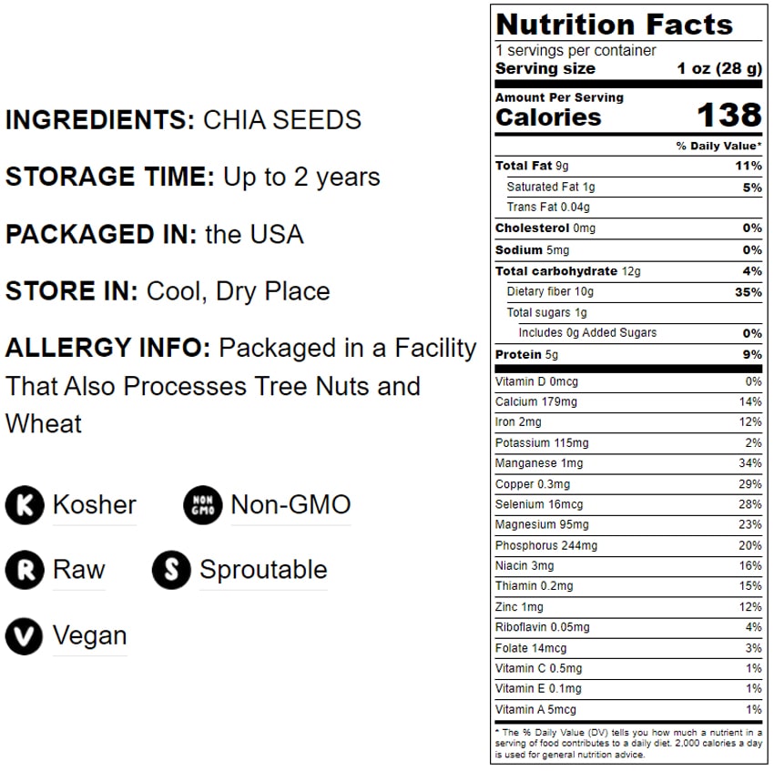 Chia seeds are becoming an extremely popular superfood and with good reason. Chia seeds are used widely in cuisine, both whole and ground into flour. People have also found quite a few applications for chia seed oil, although it has yet to gain the popularity it deserves. Chia seeds are a fantastic culinary ingredient that you can enjoy in many ways. The easiest and one of the most popular ways is to add them to your smoothie. Food To Live Chia Seeds are grown, harvested, and processed using the safest and most efficient practices to provide their high quality. Chia Seeds from Food To Live are a food your whole family can enjoy. This product can be included in a variety of recipes and it will make any dish better due to its high nutritional value. ??NUTRITION BOOST: Chia seeds are packed with essential nutrients and are perfect for smoothies. ??IMPROVED DIGESTIVE HEALTH: Fiber from chia seeds helps keep your gastrointestinal tract healthy. ??HEART HEALTH SUPPORT: Our Chia Seeds promote heart health by lowering cholesterol. ??EFFECTIVE BODY WEIGHT MANAGEMENT: A diet including chia seeds can help you to to shed extra pounds faster