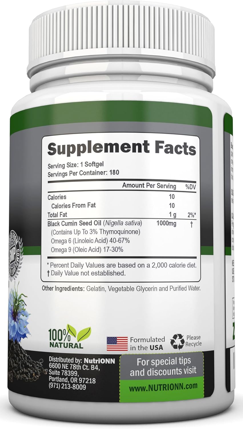 About this item SUPER HIGH In Thymoquinone - Our Black Seed Oil contains up to 3% Thymoquinone. The highest potency Black Seed Oil supplement on the market! Thymoquinone gives Black Seed Oil its powerful health benefits. Cold-pressed & Non-GMO Black Seed Oil – Our Black Seed Oil is extracted from non-GMO plants without hexane. NutriONN Black Seed Oil is cold-pressed and unrefined. POWERFUL IMMUNITY - NutriONN Black Seed Oil is very high in antioxidants like thymoquinone. Antioxidants may support the immune system function. Why Choose NutriONN - As a small company, we value our clients and our open and honest approach has kept them coming back since 2013. We make sure to choose our ingredients carefully to provide you with high quality products. 100% MONEY BACK PROMISE – If there is anything you don’t like about our product we will give you a 100% refund. No questions asked. At NutriONN our number one priority is to make sure our customers are happy and healthy. › See more product details,SUPER HIGH In Thymoquinone - Our Black Seed Oil contains up to 3% Thymoquinone. The highest potency Black Seed Oil supplement on the market! Thymoquinone gives Black Seed Oil its powerful health benefits,Cold-pressed & Non-GMO Black Seed Oil – Our Black Seed Oil is extracted from non-GMO plants without hexane. NutriONN Black Seed Oil is cold-pressed and unrefined,POWERFUL IMMUNITY - NutriONN Black Seed Oil is very high in antioxidants like thymoquinone. Antioxidants may support the immune system function,Why Choose NutriONN - As a small company, we value our clients and our open and honest approach has kept them coming back since 2013. We make sure to choose our ingredients carefully to provide you with high quality products,100% MONEY BACK PROMISE – If there is anything you don’t like about our product we will give you a 100% refund. No questions asked. At NutriONN our number one priority is to make sure our customers are happy and healthy