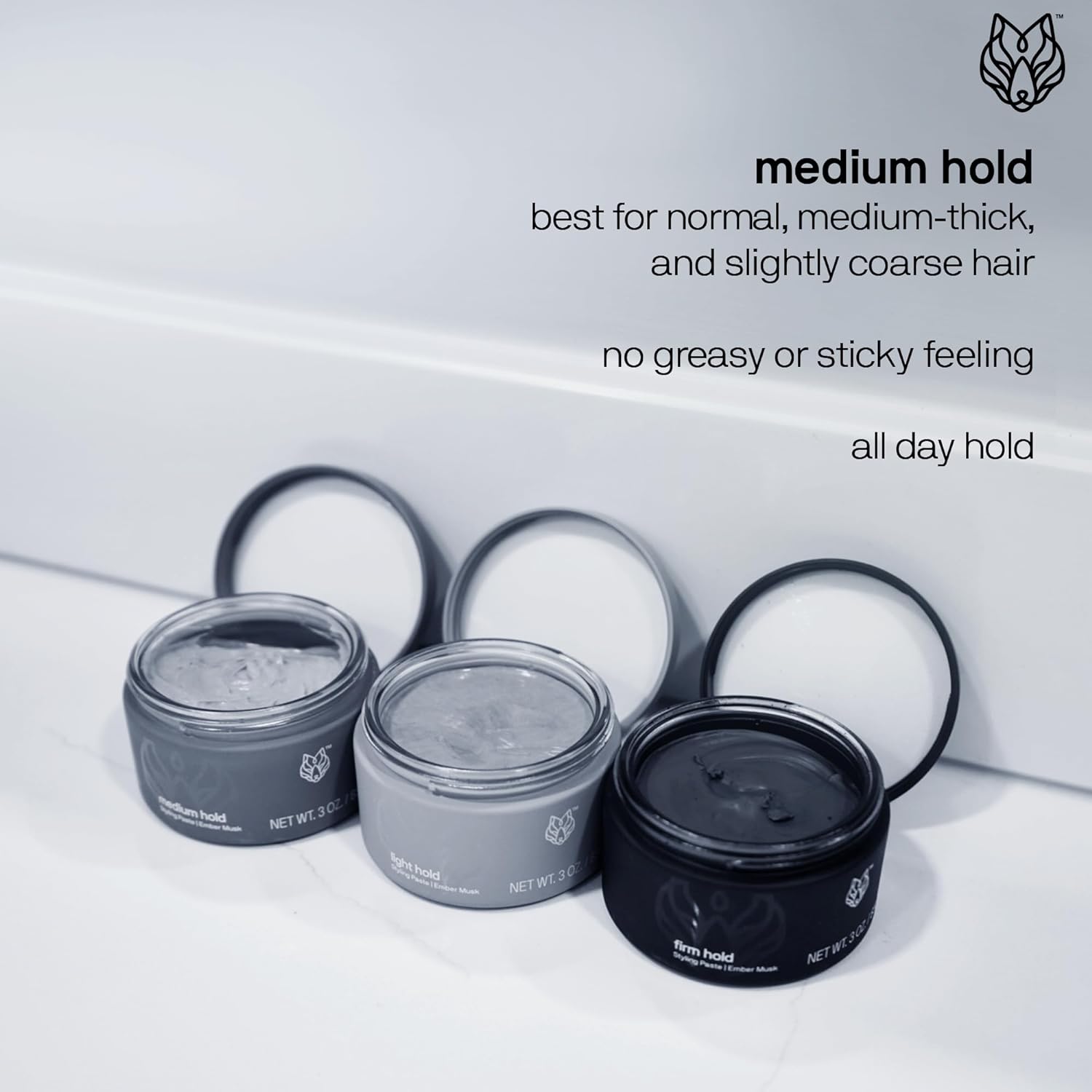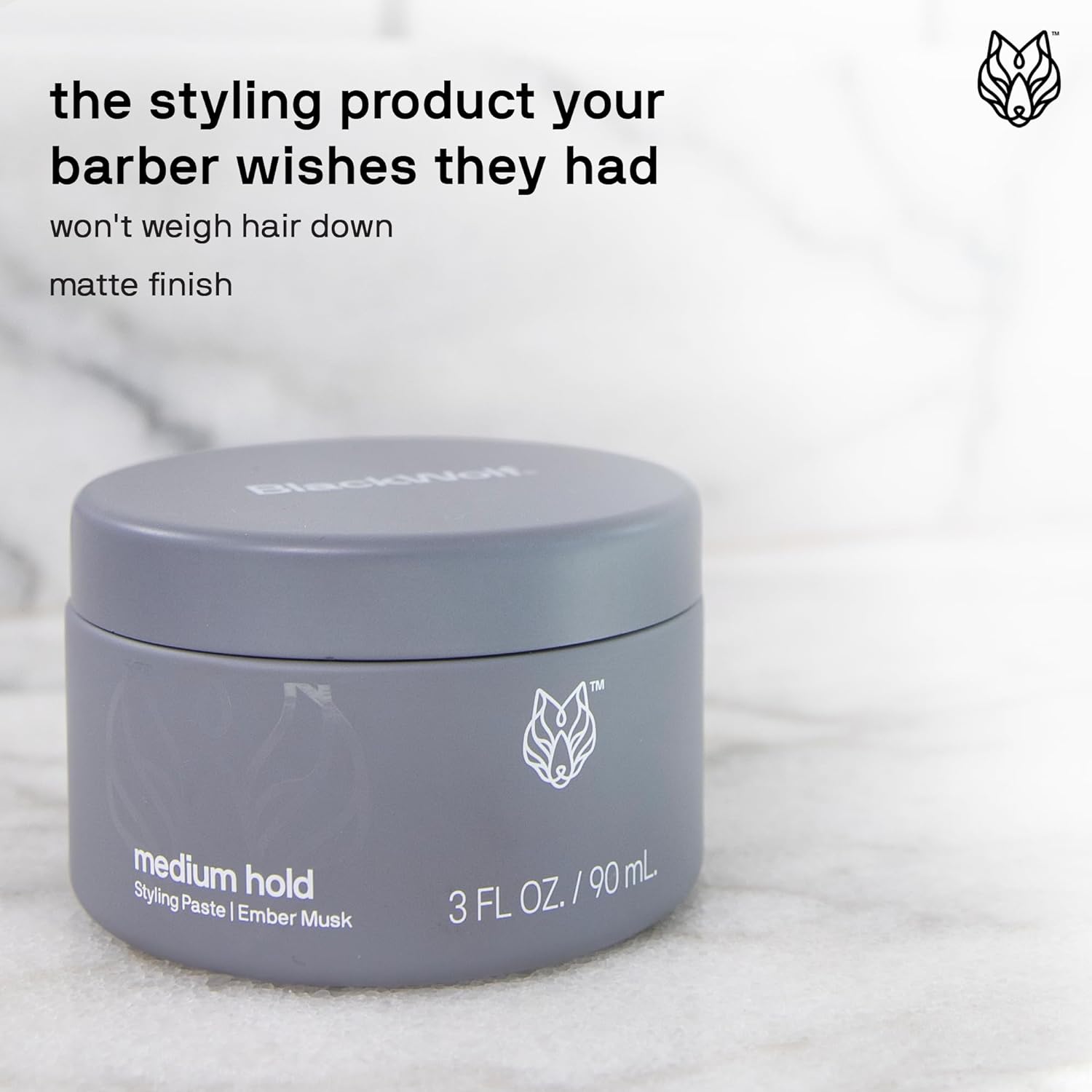 The Styling Product Your Barber Wishes They Had: Black Wolf Styling Paste makes styling your hair a breeze. It helps create texture and volume, for the perfect style. 3 fl oz. Medium holdA Hold for Every Hair Type: Medium hold styling paste works best for normal, medium-thick, and slightly coarse hair. It provides a balance between control and flexibility, allowing for natural movement and a touchable finishTexturizes & Smooths Hair: Use Black Wolf Styling Paste to create textured looks with a matte finish. It’s lightweight, so it won’t weigh your hair down, and doesn’t leave behind a greasy or sticky feelingHow to Use: Simply apply a dime-sized amount to your hand, work it into your hand for 2-3 seconds, and style as desiredExtra Effective Personal Care for Guys: At Black Wolf, we’re reinventing the men’s grooming category, one product at a time. We provide extra effective personal care for guys—without the extra. We use simple formulas and high-quality ingredients to help you look and feel your best. And it’s reasonably priced, meaning that any guy can be a Black Wolf GuyBlack Wolf Hair Styling Paste for Men, Medium Hold - Water Based Hair Styling Product for All Hair Styles & Types - Barber Grade Non-Greasy & Long-Lasting Wax - Add Texture & Volume, 3 oz