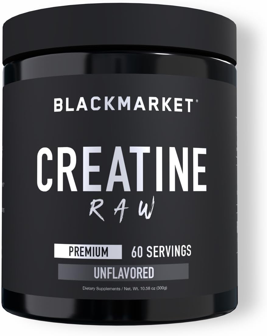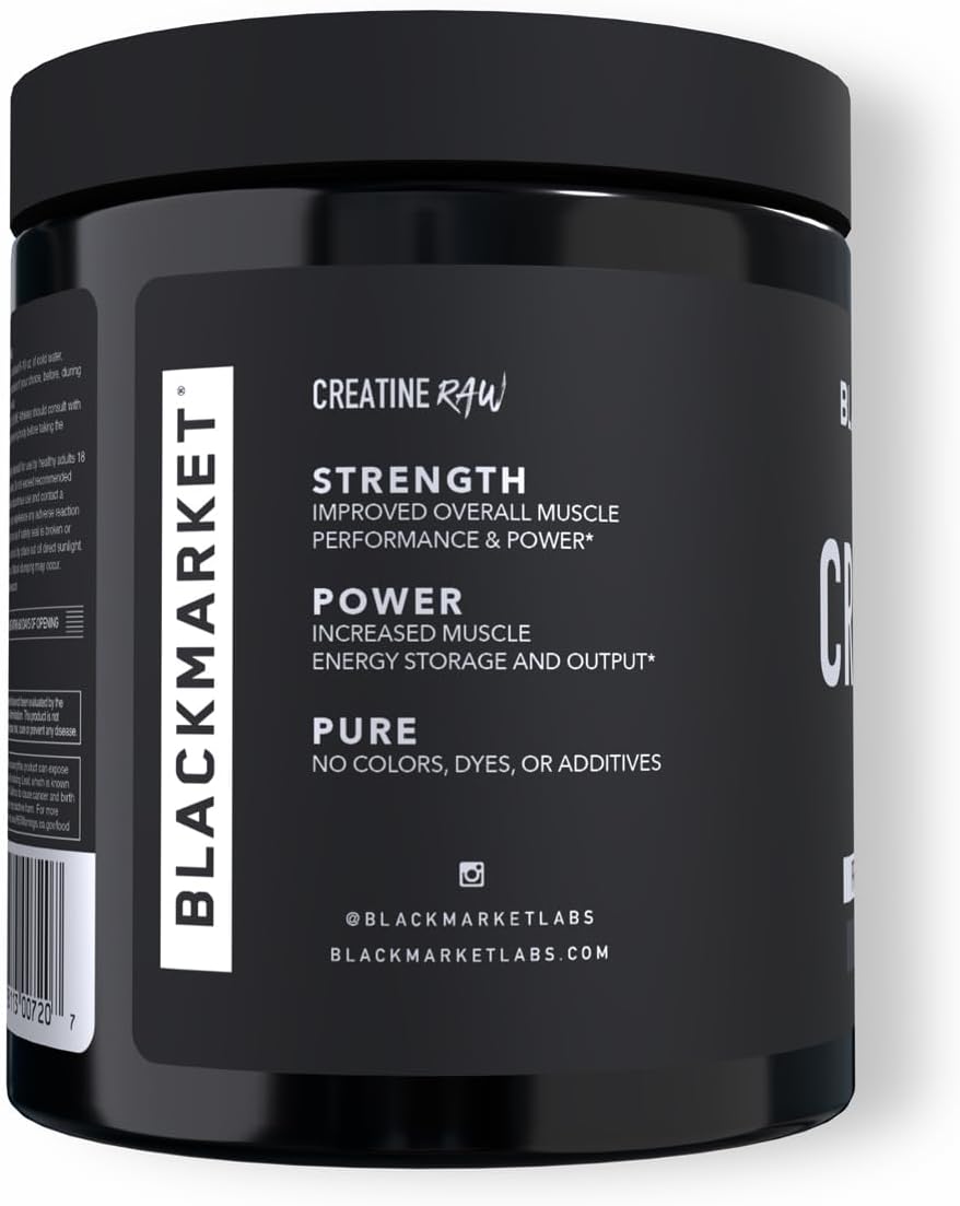 About this item Made for Muscle: Give yourself a strength boost by adding Creatine to your other workout drink mixes. A powdered supplement that improves strength, increases lean muscle mass, and helps the muscles recover more quickly during exercise. Great to Mix: Pair this raw powder ingredient with your other favorite BlackMarket workout drink mixes for an extra muscle growth boost, or add to your own workout recipes or protein shakes. Why Creatine: Creatine Monohydrate powder increases muscular size, strength, and definition. A superior micronized powder that provides rapid absorption and improved performance. American Crafted: BlackMarket's in house labs deliver on rigorous quality and safety tests. All goods are third-party tested for quality, safety, and purity; every batch tested internally for consistency, quality, and flavor. Expect the best in a pre-workout formulated, blended, and packaged in the USA. 100% Satisfaction Guaranteed: At BlackMarket, our goal is to help you accomplish yours! We design our sports nutrition products to support your hard work and achieve real results. If you are not completely satisfied with any of our products, please let our customer service team know. โบ See more product details,Made for Muscle: Give yourself a strength boost by adding Creatine to your other workout drink mixes. A powdered supplement that improves strength, increases lean muscle mass, and helps the muscles recover more quickly during exercise,Great to Mix: Pair this raw powder ingredient with your other favorite BlackMarket workout drink mixes for an extra muscle growth boost, or add to your own workout recipes or protein shakes,Why Creatine: Creatine Monohydrate powder increases muscular size, strength, and definition. A superior micronized powder that provides rapid absorption and improved performance,American Crafted: BlackMarket's in house labs deliver on rigorous quality and safety tests. All goods are third-party tested for quality, safety, and purity; every batch tested internally for consistency, quality, and flavor. Expect the best in a pre-workout formulated, blended, and packaged in the USA,100% Satisfaction Guaranteed: At BlackMarket, our goal is to help you accomplish yours! We design our sports nutrition products to support your hard work and achieve real results. If you are not completely satisfied with any of our products, please let our customer service team know
