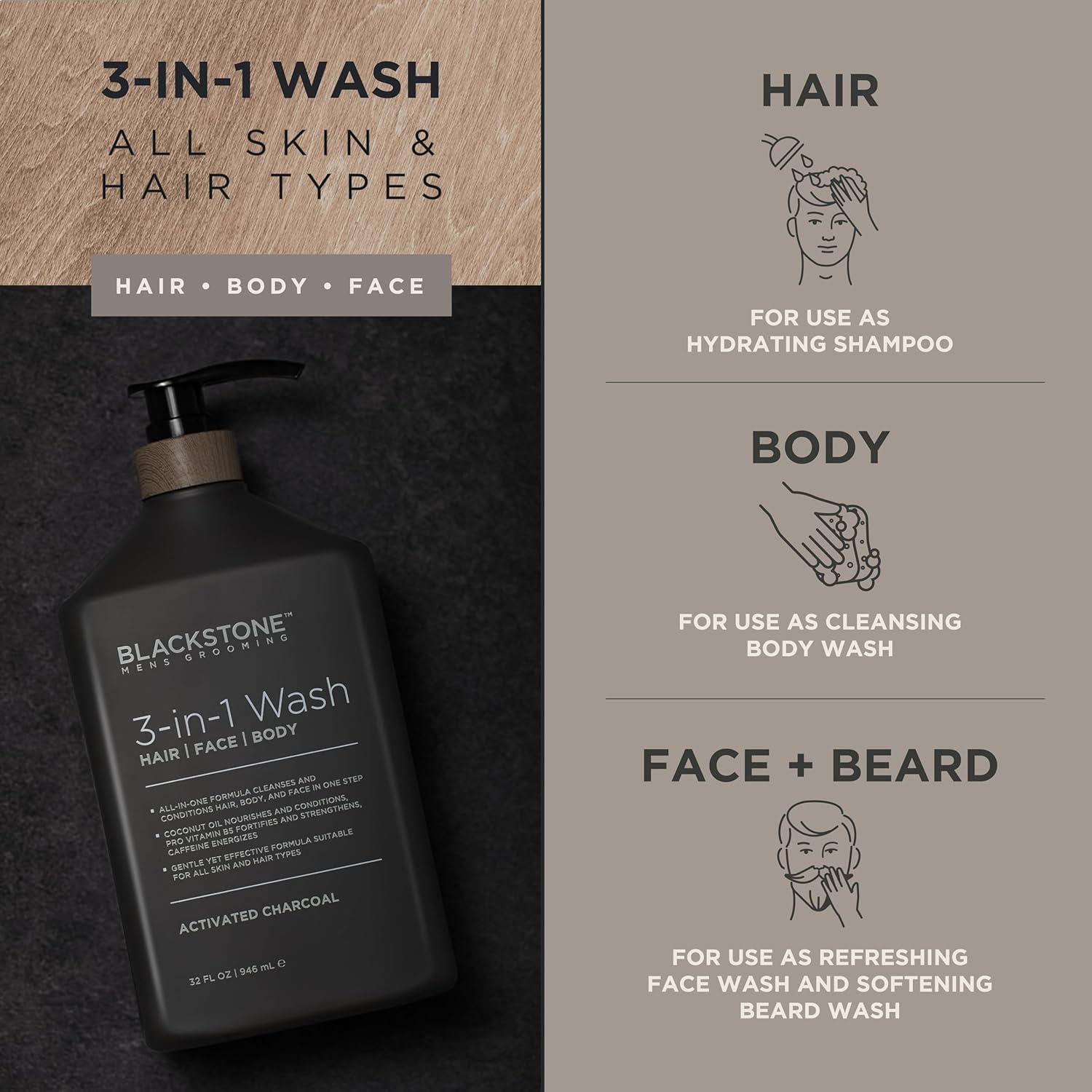 About this item BLACKSTONE MEN'S GROOMING 3-IN-1 HAIR, FACE, AND BODY WASH: Energizing hair, face and body cleanser formulated for men. Activated Charcol, 32 Fl Oz. ONE EASY STEP: Simplify your routine with the ultimate all-purpose wash designed for your hair, face and body. Washes away dirt And sweat in one easy step without over-drying. MAINTAIN OVERALL HEALTH OF SKIN AND HAIR: This multi-purpose wash is formulated with Coconut Oil, Pro Vitamin b5 and Caffeine to maintain overall health of skin and hair for all hair and skin types. NOURISHING FORMULA: This nourishing formula provides a rich lather that eliminates dirt and impurities without stripping skin and hair of essential moisture. Paraben Free, Cruelty Free, Made in USA See more product details,BLACKSTONE MEN'S GROOMING 3-IN-1 HAIR, FACE, AND BODY WASH: Energizing hair, face and body cleanser formulated for men. Activated Charcol, 32 Fl Oz,ONE EASY STEP: Simplify your routine with the ultimate all-purpose wash designed for your hair, face and body. Washes away dirt And sweat in one easy step without over-drying,MAINTAIN OVERALL HEALTH OF SKIN AND HAIR: This multi-purpose wash is formulated with Coconut Oil, Pro Vitamin b5 and Caffeine to maintain overall health of skin and hair for all hair and skin types,NOURISHING FORMULA: This nourishing formula provides a rich lather that eliminates dirt and impurities without stripping skin and hair of essential moisture,Paraben Free, Cruelty Free, Made in USA