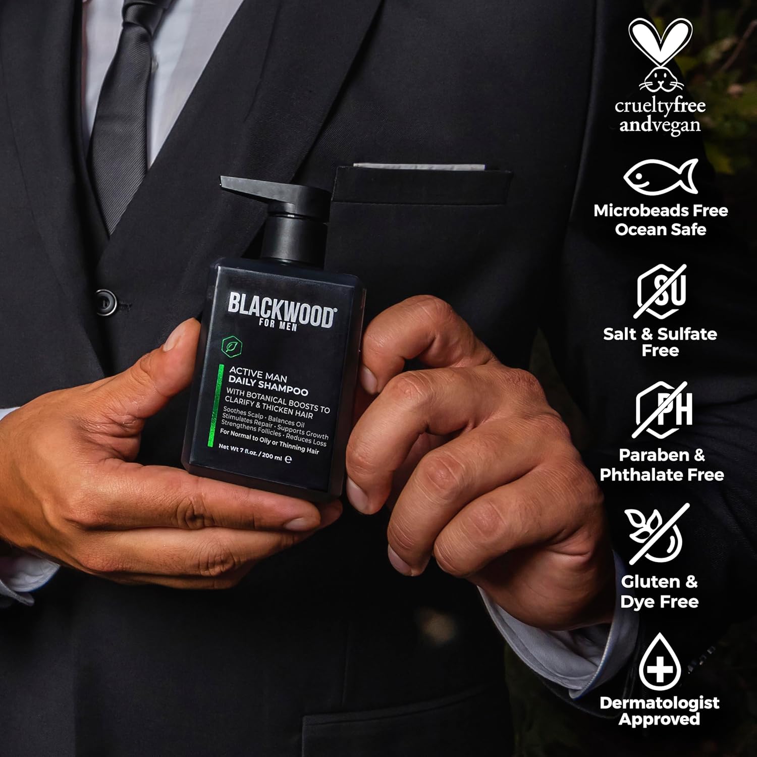 Blackwood For Men Active Man Daily Shampoo - Thickening & Clarifying Shampoo For Normal To Oily Hair Or Scalp - Fights Hair Loss - Natural Vegan Formula - Sulfate Free With Ginseng & Aloe Vera (7Oz)