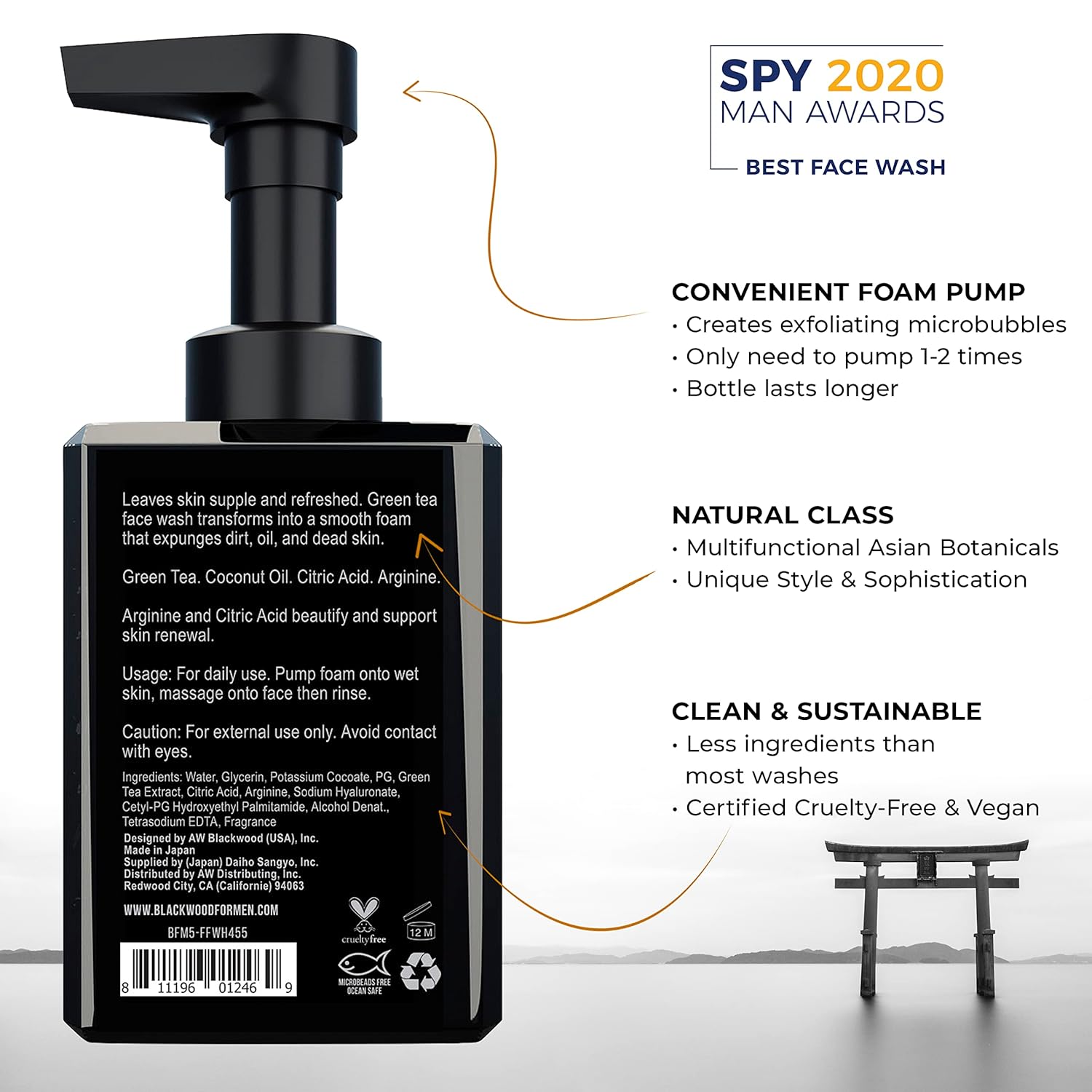 About this item AWARD WINNING: Our award-winning face wash, voted BEST Face Wash of the Year by the SPY Man Awards, is a clean & natural option for men. With a simple ingredient list, it's perfect for those with dry, normal, or sensitive skin. NOURISHING BIONUTRIENTS: Our foaming face wash for men contains bionutrients, such as Green Tea, Hyaluronic Acid, & Arginine that are naturally derived to purify & enrich the skin, so you can look your best all day. DEEP CLEANSE: This mens face wash contains a potent dose of organic Green Tea, known for its anti-inflammatory & antioxidant properties. Green Tea helps to reduce redness & inflammation, fight breakouts & stimulate cell repair REFRESH: The gentle formula effectively removes dirt, oil & impurities without over-drying the skin, leaving it feeling clean, refreshed & revitalized. Also reduces puffiness & dark circles. Ideal for dry to sensitive skin, leaving it feeling rejuvenated! SAFE & NATURAL INGREDIENTS: Our face wash for men contains safe and natural ingredients that are free from parabens, sulfates, and harsh miscellaneous chemicals that can irritate sensitive skin. Feel the purity of Blackwood's foaming facial wash! See more product details,AWARD WINNING: Our award-winning face wash, voted BEST Face Wash of the Year by the SPY Man Awards, is a clean & natural option for men. With a simple ingredient list, it's perfect for those with dry, normal, or sensitive skin,NOURISHING BIONUTRIENTS: Our foaming face wash for men contains bionutrients, such as Green Tea, Hyaluronic Acid, & Arginine that are naturally derived to purify & enrich the skin, so you can look your best all day,DEEP CLEANSE: This mens face wash contains a potent dose of organic Green Tea, known for its anti-inflammatory & antioxidant properties. Green Tea helps to reduce redness & inflammation, fight breakouts & stimulate cell repair,REFRESH: The gentle formula effectively removes dirt, oil & impurities without over-drying the skin, leaving it feeling clean, refreshed & revitalized. Also reduces puffiness & dark circles. Ideal for dry to sensitive skin, leaving it feeling rejuvenated!,SAFE & NATURAL INGREDIENTS: Our face wash for men contains safe and natural ingredients that are free from parabens, sulfates, and harsh miscellaneous chemicals that can irritate sensitive skin. Feel the purity of Blackwood's foaming facial wash!