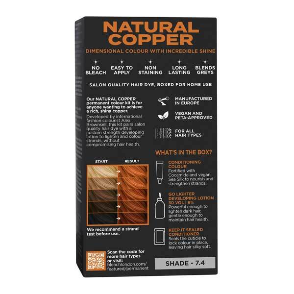 Product Information:Vegan permanent hair dye in shade Natural Copper,Features:1 X Conditioning Colour Tube (Mix 1:1) 60 Ml / 2.1 Fl. Oz. 1 X Bottle Of Go Lighter Developing Lotion (Peroxide) 60 Ml / 2.1 Fl. Oz. 1 X Keep It Sealed Conditioner Sachet 20 Ml /0.68 Fl. Oz. 1 X Pair Of Plastic Gloves 1 X Instruction Leaflet,Warning or Restrictions:WHOâS IT FOR? This product is only for use on healthy, undamaged hair. Wait at least 14 days after bleaching, relaxing or perming before colouring. DO NOT USE on hair that has ever been dyed with henna or permanent hair dye. We always recommend a strand test to check that you are happy with the colour and condition of your hair. You may need to use more than one pack if your hair is long or thick. WARNING: For external use only. This product is not intended for use on persons under the age of 16. Always read and follow instructions. Hair colourants can cause severe allergic reactions. Temporary âblack hennaâ tattoos may increase risk of allergy,Product Specification:Aqua (Water), Cocamide MEA, Ceteareth-6, Polysorbate 80, Ammonium Hydroxide, Cetearyl Alcohol, Sodium Sulfite, Parfum (Fragrance), 2-Amino-3-Hydroxypyridine, Ascorbic Acid, Trisodium HEDTA, 4-Amino-2-Hydroxytoluene, 4-Amino-m-Cresol, Toluene-2,5-Diamine Sulfate, 2-Amino-6-Chloro-4-Nitrophenol, Resorcinol, Dipropylene Glycol, Hydrolyzed Rhodophyceae Extract, Geraniol, Hexyl Cinnamal, Limonene, Linalool,Product Uses:STEP BY STEP: 1: SECTION Divide hair into 4 quarters & secure 2: MIX Mix the Conditioner Colour tube with the Developing lotion 3: SLICE & APPLY Take thin slices of hair & paint on the colour 4:SMOOSH! Coat every strand 5:DEVELOPING Leave colour on according to instructions provided 6: SHAMPOO Wash out the colour 7:CONDITION Apply Seal The Deal Conditioner ---- What you'll need: No Bleach Permanent Colour Kit Eco-conut Bowl and tint brush Crocodile Clips An old t-shirt or Bleach proof towel Warnings: For external use only. This product is not intended for use on persons under the age of 16. Always read and follow instructions. Hair colourants can cause severe allergic reactions. Temporary âblack hennaâ tattoos may increase risk of allergy. How to prepare: You must do a strand and sensitivity test 48 hours before colouring to check how your hair will look and feel during and after the process (and that you're not allergic to the product!) You must do these tests every time you colour, even if youâve done them before. See information leaflet for a step by step guide. You must carry out a strand test on your hair before using colour to check your hair's condition and how it will look and feel after colouring. Do not colour your hair if the strand test feels damaged or you donât like how it feels. Read all instructions that come with your product before use. The final shade can be influenced by many factors including: current colour, condition, porosity, length and thickness of hair as well as any previous treatments,Recyclable:box - recycled cardboard sachet - other bottle - HDPE - plastic cap - PP - plastic tube - aluminium cap - PP plastic
