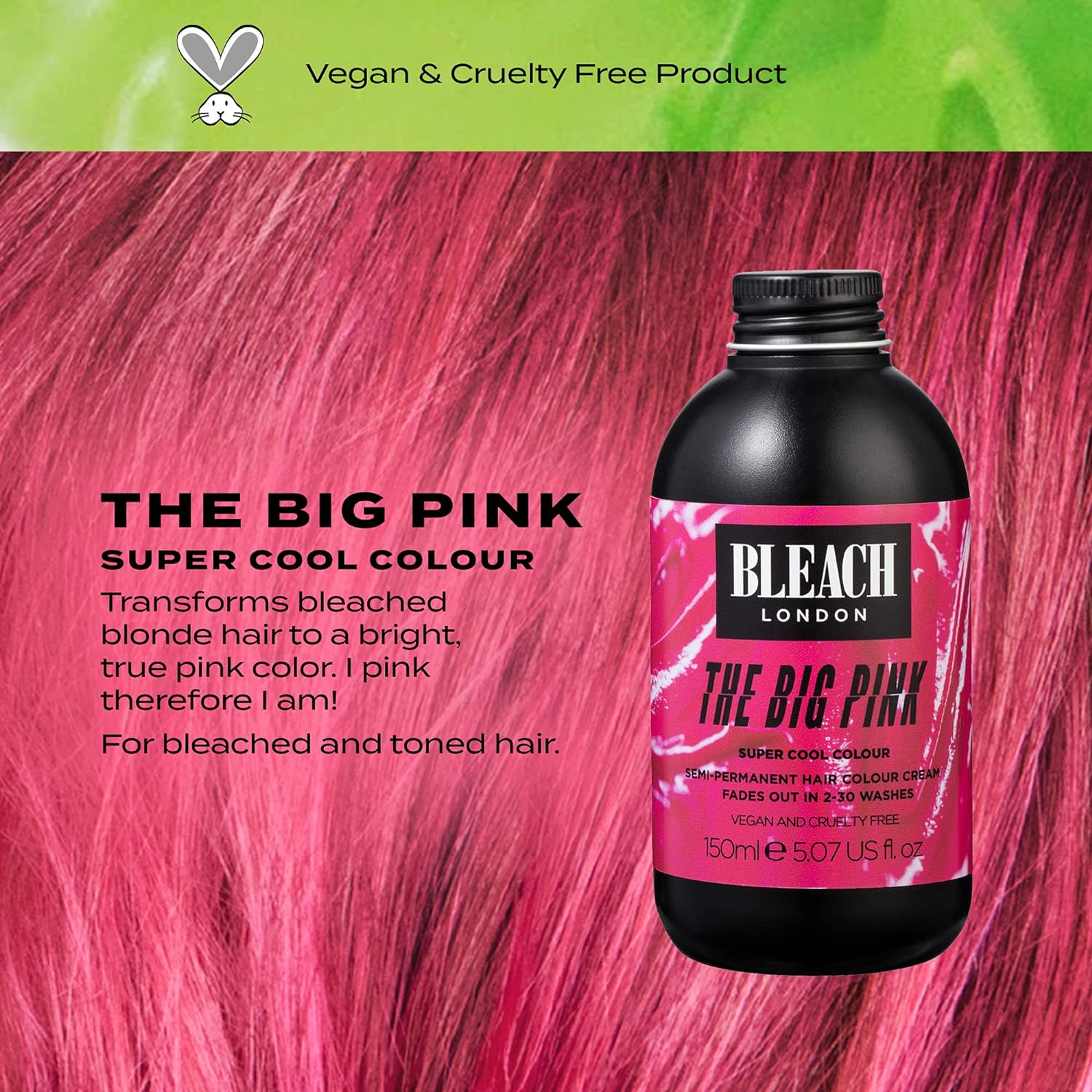 BLEACH LONDON The Big Pink Super Cool Color - Semi-Permanent Hair Color, Bright True Pink, Vegan, Cruelty Free, Vibrant Temporary Hair Color Cream, 5.07
