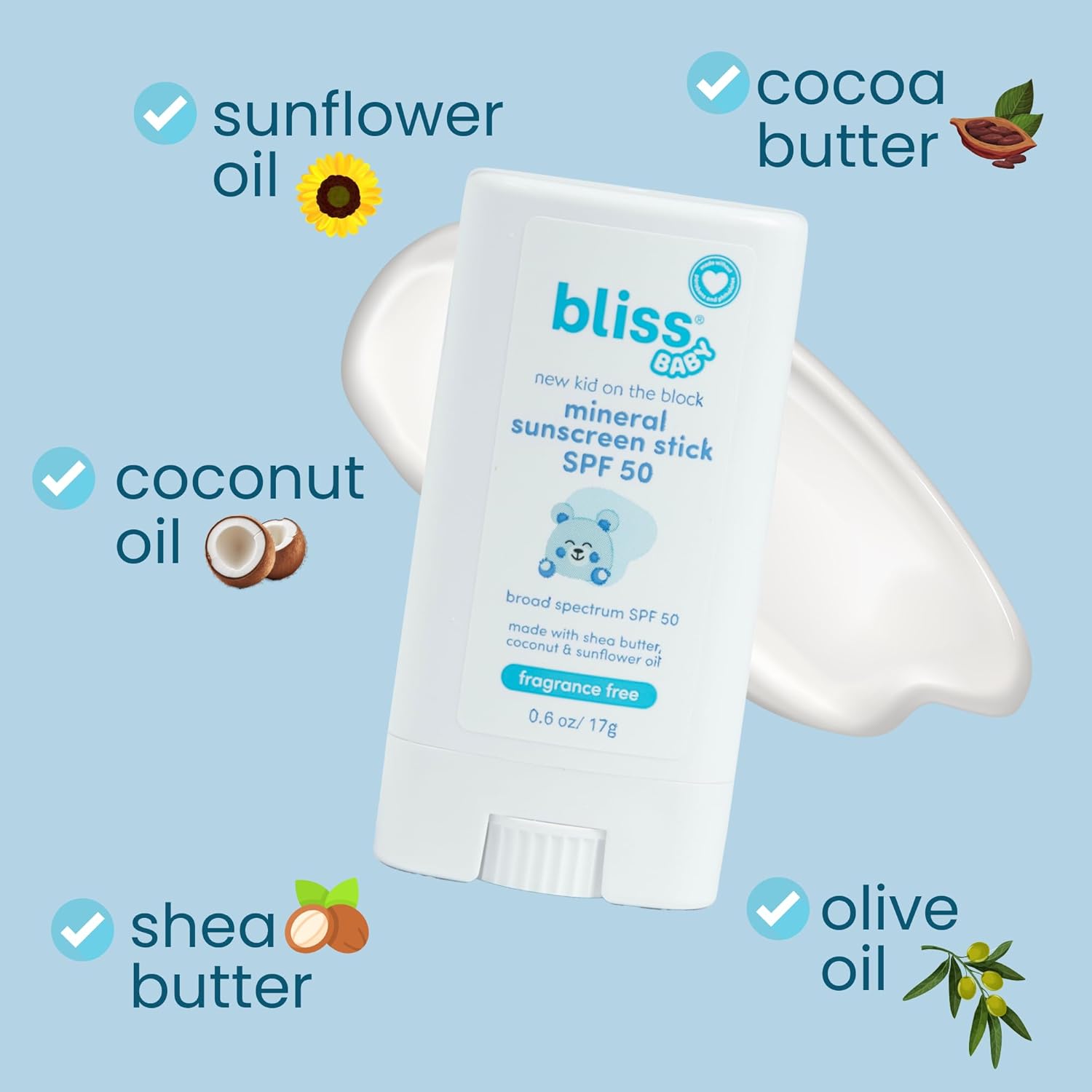 About this item BLISSFUL PROTECTION: Bliss baby mineral sunscreen provides gentle, safe & natural mineral zinc oxide based SPF 50 sun protection. Face & body protection for babies, kids & adults with sensitive skin. Broad spectrum UVA & UVB sunscreen, great for daily use. Natural non-nano zinc oxide offers gentle defense against the sun’s rays on sensitive skin. BLISSFULLY GENTLE: Our mineral formula is fragrance-free, vegan and formulated with plant-based ingredients to provide SPF protection + nourish & hydrate skin. Infused with Organic Shea Butter and Organic Coconut Oil to gently soothe and moisturize skin while protecting against the sun's rays! WATER RESISTANT: Our baby sunscreen stick offers up to 80 minutes of water resistance, allowing your little one to splash, swim, and play without worry. Non-toxic Sunscreen Formula for Toddlers, Babies, Kids, and Adults with Sensitive Skin. EASY AND EFFORTLESS APPLICATION: Our baby sunscreen is a breeze to apply, even on wiggly little ones. It absorbs instantly, leaving skin soft and protected, without any greasy or sticky feel. Designed to blend in and protect against the suns rays! FAMILY-FRIENDLY FORMULA: Our gentle, mineral-based sunscreen is designed for every age. It's safe for babies, kids, and adults with sensitive skin, making it the perfect choice for the whole family! Free of - Oxybenzone or Octinoxate, Parabens, Phthalates, Gluten, Dairy, Mineral Oil and Silicones. See more product details,BLISSFUL PROTECTION: Bliss baby mineral sunscreen provides gentle, safe & natural mineral zinc oxide based SPF 50 sun protection. Face & body protection for babies, kids & adults with sensitive skin. Broad spectrum UVA & UVB sunscreen, great for daily use. Natural non-nano zinc oxide offers gentle defense against the sun’s rays on sensitive skin,BLISSFULLY GENTLE: Our mineral formula is fragrance-free, vegan and formulated with plant-based ingredients to provide SPF protection + nourish & hydrate skin. Infused with Organic Shea Butter and Organic Coconut Oil to gently soothe and moisturize skin while protecting against the sun's rays!,WATER RESISTANT: Our baby sunscreen stick offers up to 80 minutes of water resistance, allowing your little one to splash, swim, and play without worry. Non-toxic Sunscreen Formula for Toddlers, Babies, Kids, and Adults with Sensitive Skin,EASY AND EFFORTLESS APPLICATION: Our baby sunscreen is a breeze to apply, even on wiggly little ones. It absorbs instantly, leaving skin soft and protected, without any greasy or sticky feel. Designed to blend in and protect against the suns rays!,FAMILY-FRIENDLY FORMULA: Our gentle, mineral-based sunscreen is designed for every age. It's safe for babies, kids, and adults with sensitive skin, making it the perfect choice for the whole family! Free of - Oxybenzone or Octinoxate, Parabens, Phthalates, Gluten, Dairy, Mineral Oil and Silicones