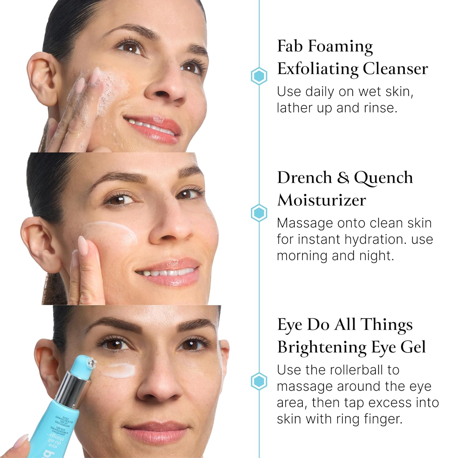 About this item ALL-IN-ONE SKINCARE ROUTINE: Includes cleanser, moisturizer, and eye gel for a complete 3-step regimen designed for all skin types. GENTLE YET EFFECTIVE CLEANSE: The 2-in-1 Foaming Facial Cleanser and Exfoliator deeply cleanses and removes dead skin cells without stripping moisture. INTENSE HYDRATION: Drench & Quench Hyaluronic Acid Face Moisturizer locks in moisture for plump, dewy skin that lasts all day. TARGETED EYE CARE: Eye Do All Things Hydrating Eye Gel reduces puffiness, brightens under-eye circles, and hydrates the delicate eye area. CLEAN, CRUELTY-FREE SKINCARE: Formulated without parabens, phthalates, or harsh chemicals, and never tested on animals, for guilt-free indulgence. See more product details,ALL-IN-ONE SKINCARE ROUTINE: Includes cleanser, moisturizer, and eye gel for a complete 3-step regimen designed for all skin types,GENTLE YET EFFECTIVE CLEANSE: The 2-in-1 Foaming Facial Cleanser and Exfoliator deeply cleanses and removes dead skin cells without stripping moisture,INTENSE HYDRATION: Drench & Quench Hyaluronic Acid Face Moisturizer locks in moisture for plump, dewy skin that lasts all day,TARGETED EYE CARE: Eye Do All Things Hydrating Eye Gel reduces puffiness, brightens under-eye circles, and hydrates the delicate eye area,CLEAN, CRUELTY-FREE SKINCARE: Formulated without parabens, phthalates, or harsh chemicals, and never tested on animals, for guilt-free indulgence