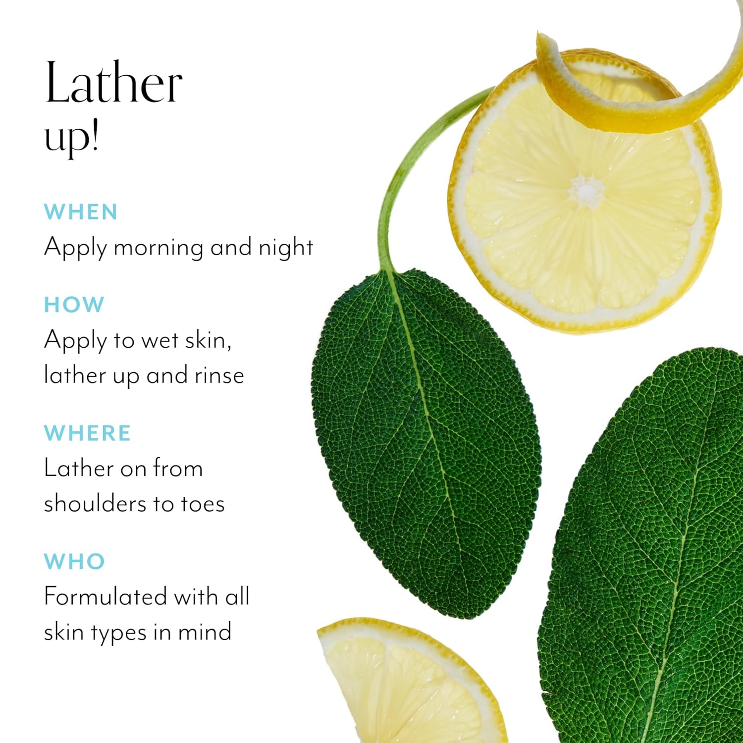 HOW TO APPLY: Apply to wet skin, lather up and rinse. Follow with Lemon & Sage Body Butter for the ultimate experience