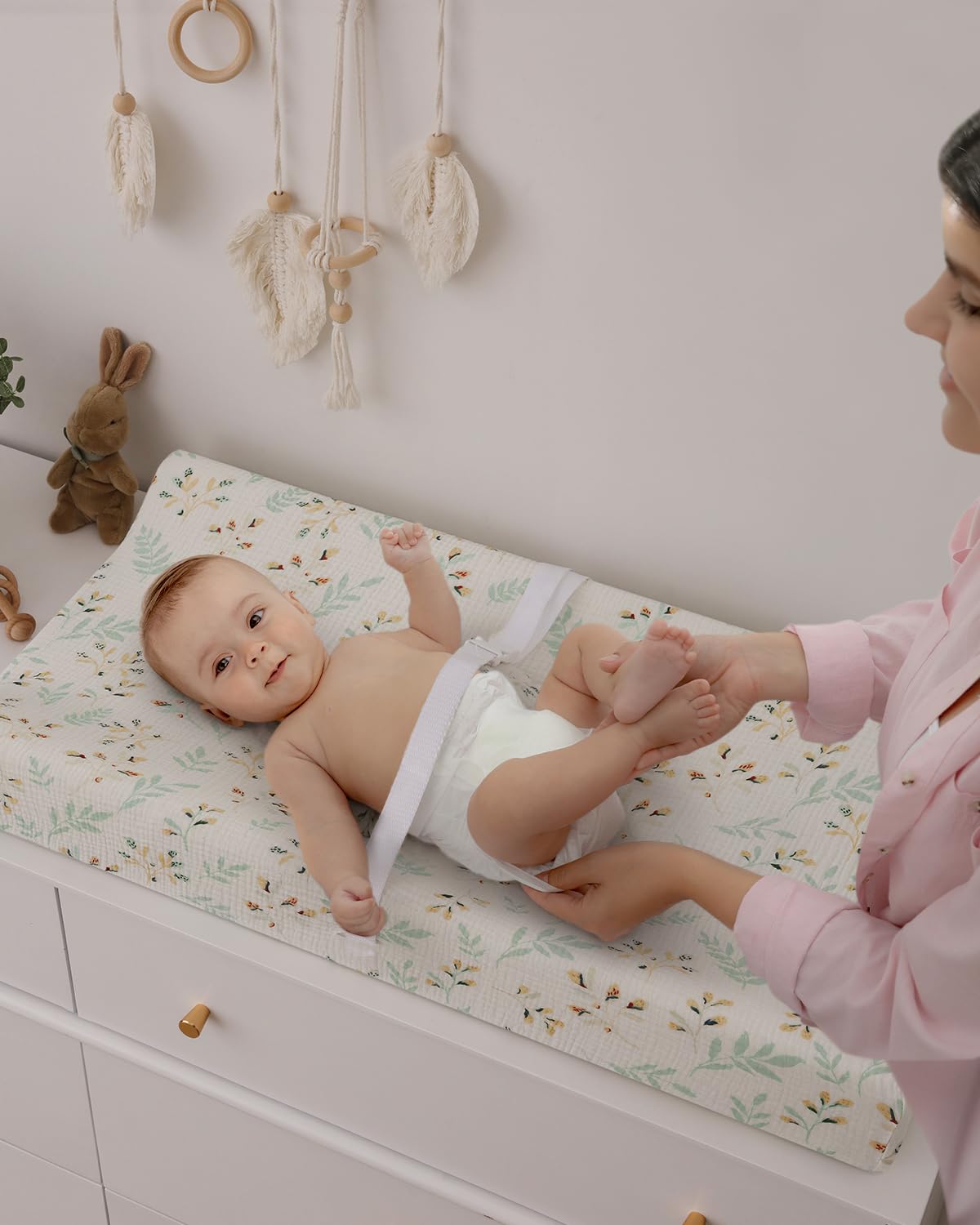 Blissful Diary Muslin Changing Pad Cover For Girls Boys, Ultra Soft Breathable Cotton, Baby Diaper Change Table Pad Covers, 2Pack (Roman Green&Leaf)