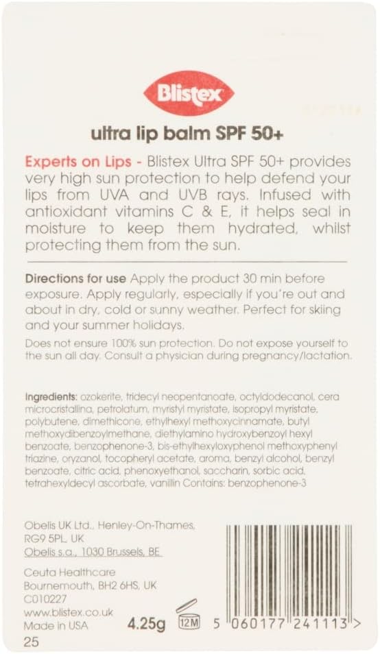 Blistex Ultra Lip Balm with SPF 50+, Lip Protection from UVA and UVB Rays - 4.25g (Pack of 12)