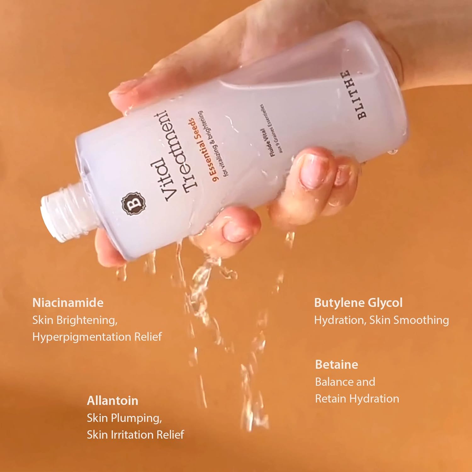 About this item VITALIZING & HYDRATING: Blithe Vital Treatment Series offers instant hydration & vitalization of the skin. The Korean essence toner is formulated with fermented raw natural ingredients that boost the skin's natural strength NIACINAMIDE TONER ESSENCE: The 9 Essential Seeds easily absorb into the skin reducing blemishes and providing a clean fresh look. The 9 Seeds & Niacinamide provides a skin lightening & moisturizing effect ORGANIC GREEN TEA TONER: Contains 78.982% extracts from 9 seeds such as Baobab Tree / Green Tea Tree / Chia / Fennel / Lotus / Rosehip that are rich in Vitamin A B C, Calcium, minerals, and antioxidants. NATURAL KOREAN SKIN CARE: This product is NOT tested on animals and contains NO Paraben, Sulfates, Formaldehyde, Mineral Oil, Urea, BHT, TEA, or Phthalates. This product is safe to use for people with sensitive skin HYDRATING & BALANCING TONER: Vital Treatment 9 is suitable for all skin types, especially troubled skin with dark spots and blemishes. Get your self care in a jar with Korean skin care essence toner from BLITHE!  See more product details,VITALIZING & HYDRATING: Blithe Vital Treatment Series offers instant hydration & vitalization of the skin. The Korean essence toner is formulated with fermented raw natural ingredients that boost the skin's natural strength,NIACINAMIDE TONER ESSENCE: The 9 Essential Seeds easily absorb into the skin reducing blemishes and providing a clean fresh look. The 9 Seeds & Niacinamide provides a skin lightening & moisturizing effect,ORGANIC GREEN TEA TONER: Contains 78.982% extracts from 9 seeds such as Baobab Tree / Green Tea Tree / Chia / Fennel / Lotus / Rosehip that are rich in Vitamin A B C, Calcium, minerals, and antioxidants,NATURAL KOREAN SKIN CARE: This product is NOT tested on animals and contains NO Paraben, Sulfates, Formaldehyde, Mineral Oil, Urea, BHT, TEA, or Phthalates. This product is safe to use for people with sensitive skin,HYDRATING & BALANCING TONER: Vital Treatment 9 is suitable for all skin types, especially troubled skin with dark spots and blemishes. Get your self care in a jar with Korean skin care essence toner from BLITHE!