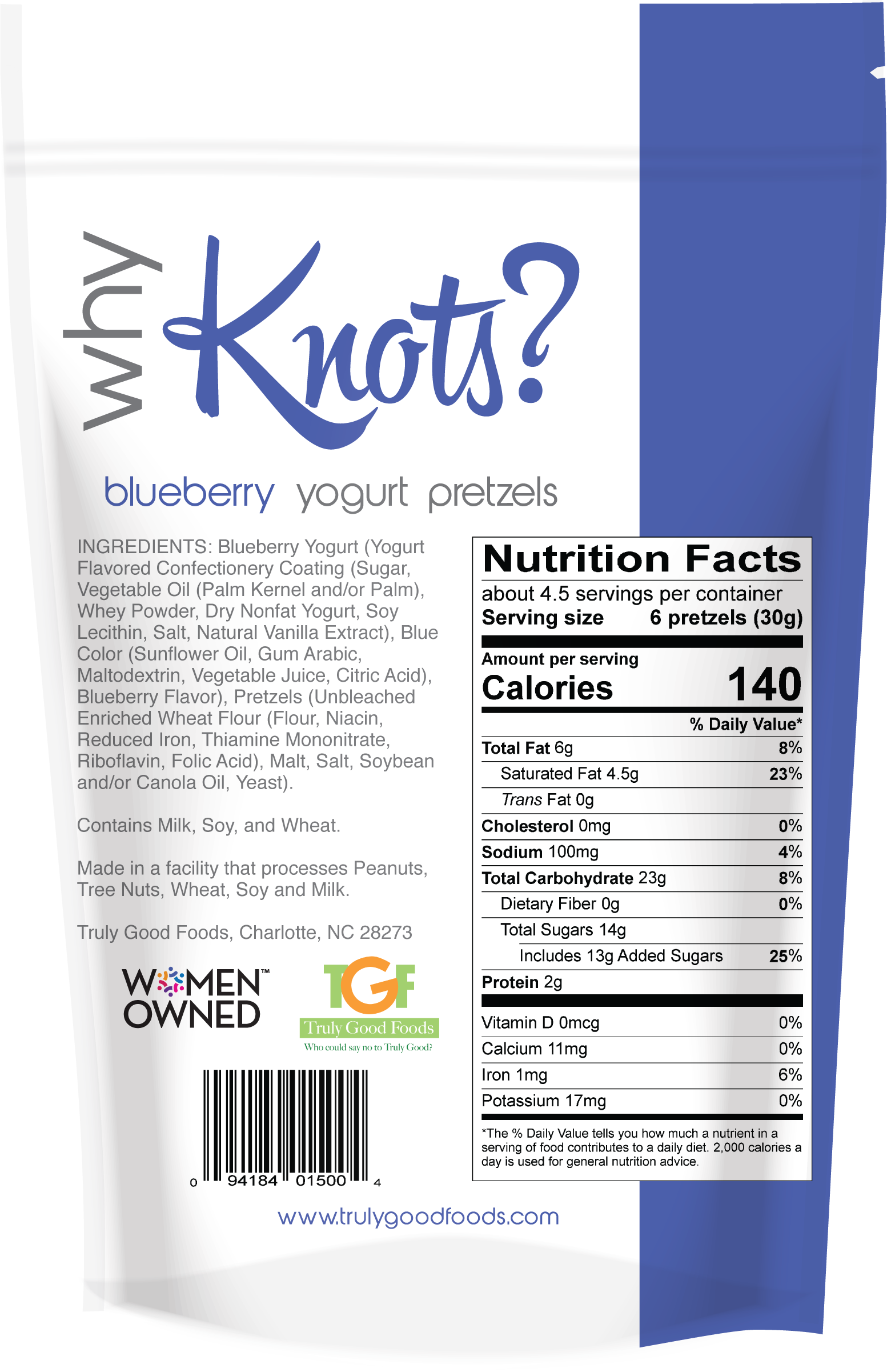 Blueberry Yogurt Pretzels taste exactly like the real thing with an added crunch. Why Knots? fulfill both sweet and salty cravings, making them the ultimate snack with a tangy twist. Available in our standup resealable bags. Bluberry Yogurt Pretzels Why Knots?, 4.5oz, 12-count