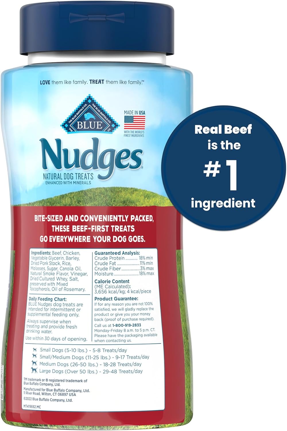 Contains: One (1) 5.5-Oz. Flip-Top Container Of Blue Nudges On-The-Go Dog Treats, Beef