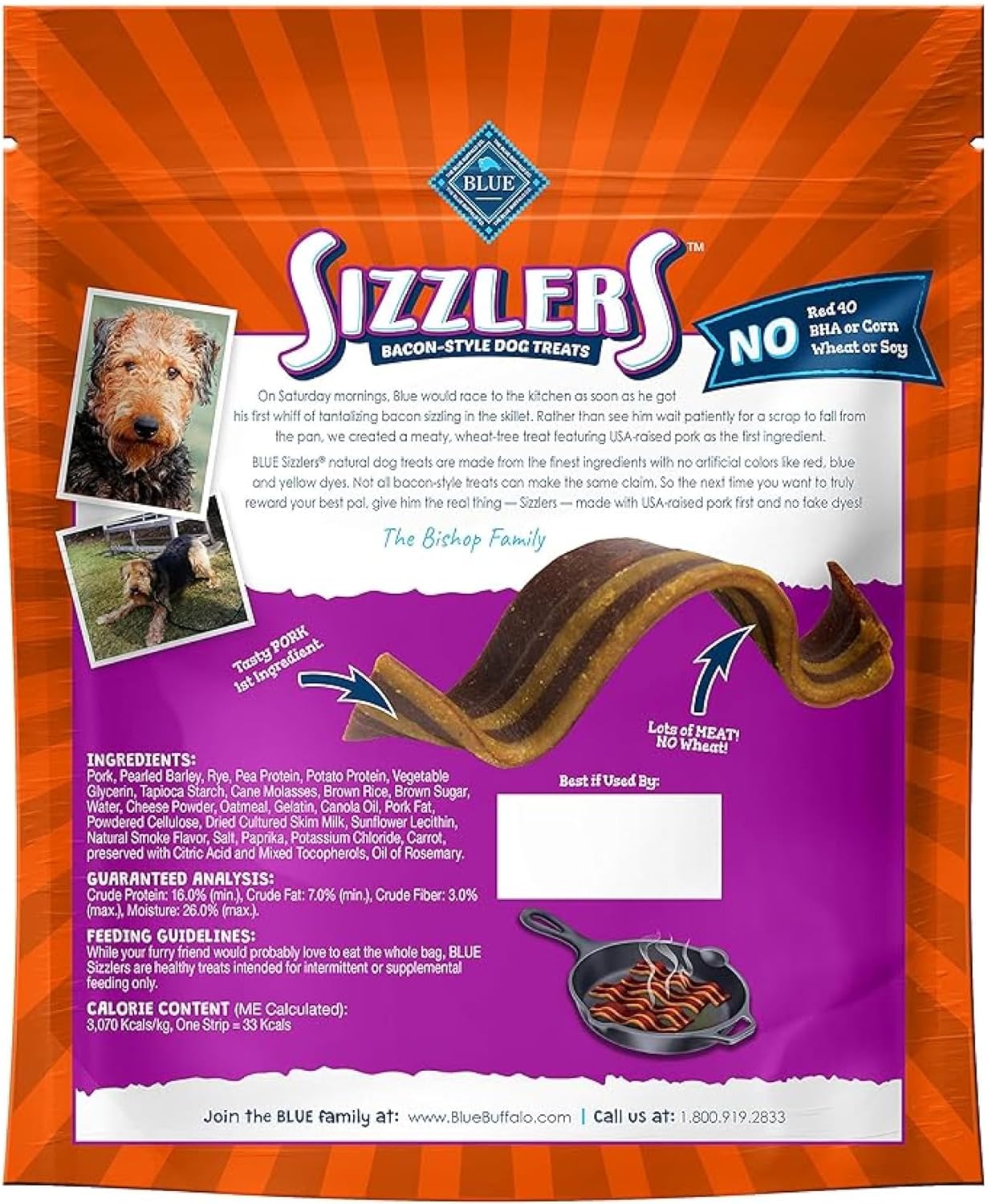 Contains: One (1) 6-oz. bags of BLUE Sizzlers Bacon-Style Soft-Moist Dog Treats, Pork Recipe