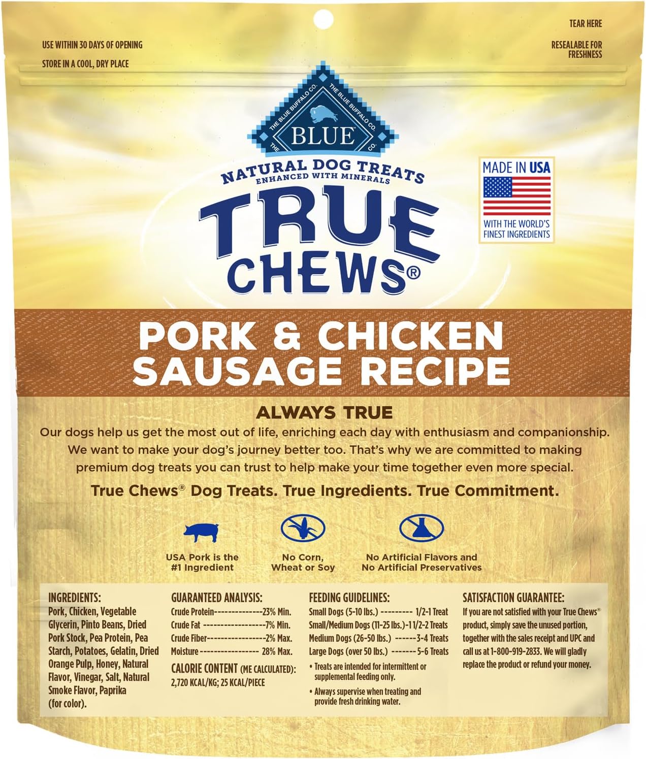 Contains: One (1) 14-Oz. Bag Of Blue True Chews Natural Chewy Dog Treats; Pork And Chicken Sausage Recipe