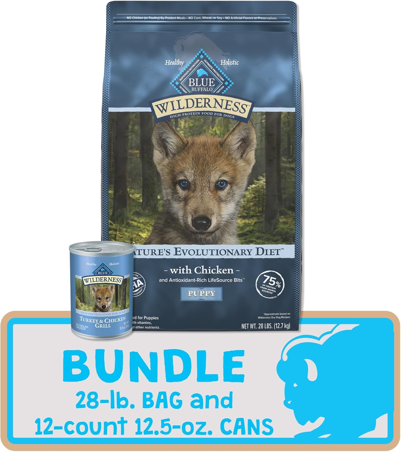 Blue Buffalo Wilderness High Protein, Natural Grain Free Puppy Dry Dog Food And Wet Puppy Food, Turkey And Chicken (24-Lb Dry Food + 12.5Oz Cans 12Ct)