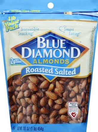 About this item Contains one 16-ounce bag of Blue Diamond oven roasted salted almonds A tasty snack with just the right amount of salt- great for your next party Low in carbs and high in protein Resealable bag makes this a perfect travel snack for adults and children on the way to the office, school, or just on the go Free of cholesterol and trans fat and an excellent source of Vitamin E › See more product details,Contains one 16-ounce bag of Blue Diamond oven roasted salted almonds,A tasty snack with just the right amount of salt- great for your next party,Low in carbs and high in protein,Resealable bag makes this a perfect travel snack for adults and children on the way to the office, school, or just on the go,Free of cholesterol and trans fat and an excellent source of Vitamin E