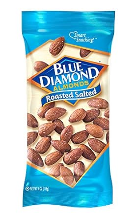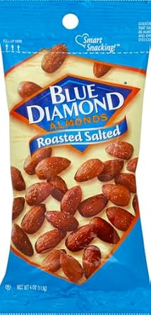 About this item Contains 12 - 4 ounce bags of Blue Diamond Roasted Salted Almonds We add just the right amount of salt to complement the almond's delicate flavor Perfect for snacking, they're also ideal for your favorite recipes 3g fiber, 0g trans fat Cholesterol free › See more product details,Contains 12 - 4 ounce bags of Blue Diamond Roasted Salted Almonds,We add just the right amount of salt to complement the almond's delicate flavor,Perfect for snacking, they're also ideal for your favorite recipes,3g fiber, 0g trans fat,Cholesterol free