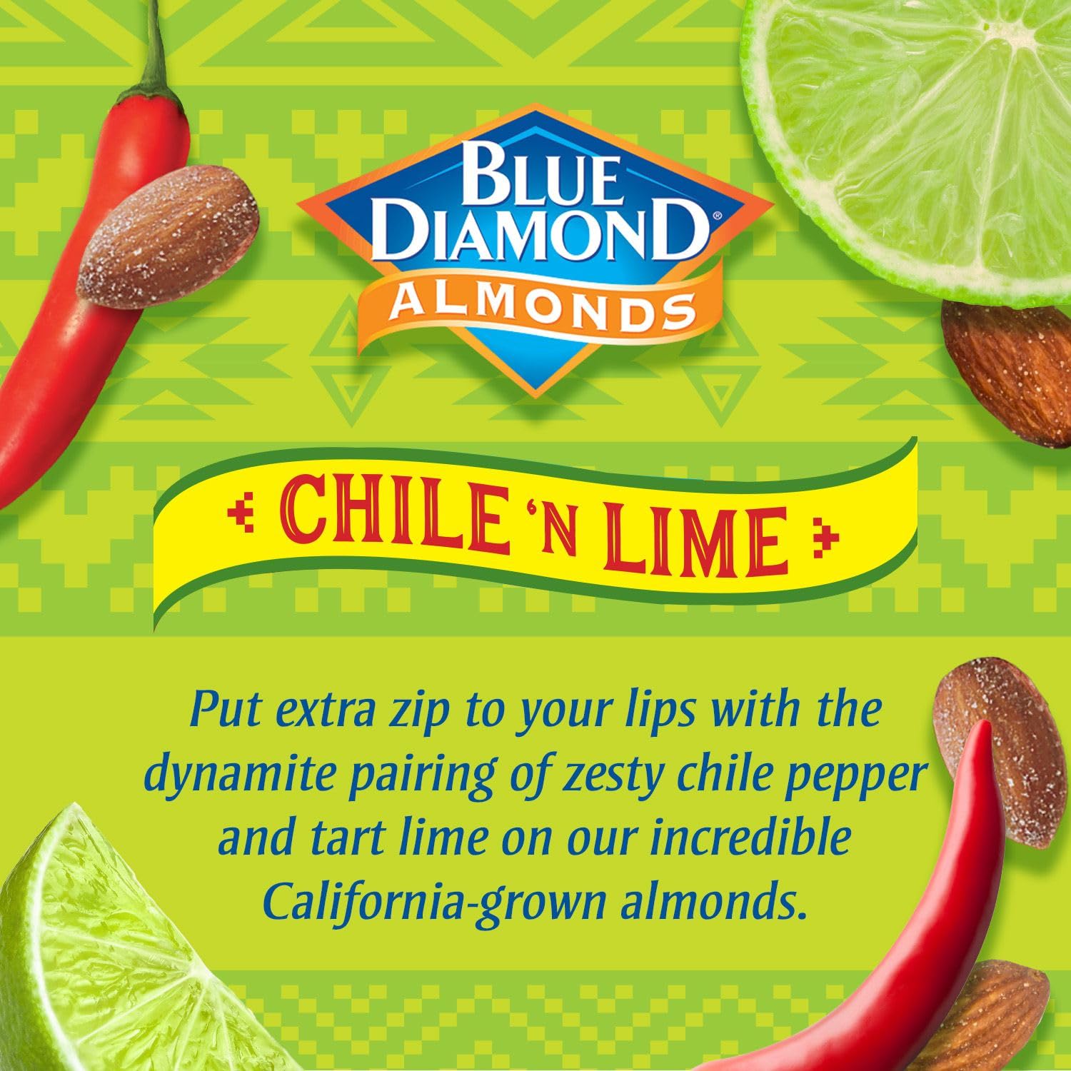 About this item Contains 1 - 6oz. Resealable Can of BOLD Blue Diamond Chile n' Lime Flavored Snack Almonds Resealable can makes this a perfect travel snack for adults and children on the way to the office, school, or just on the go. These Chile 'N Lime Almonds have a medium spice level and they're perfect for snacking. Each serving contains 6 grams of protein The zesty kick of a chile with the added lime flavor is the flavor-lovers almond choice › See more product details,Contains 1 - 6oz. Resealable Can of BOLD Blue Diamond Chile n' Lime Flavored Snack Almonds,Resealable can makes this a perfect travel snack for adults and children on the way to the office, school, or just on the go,These Chile 'N Lime Almonds have a medium spice level and they're perfect for snacking,Each serving contains 6 grams of protein,The zesty kick of a chile with the added lime flavor is the flavor-lovers almond choice