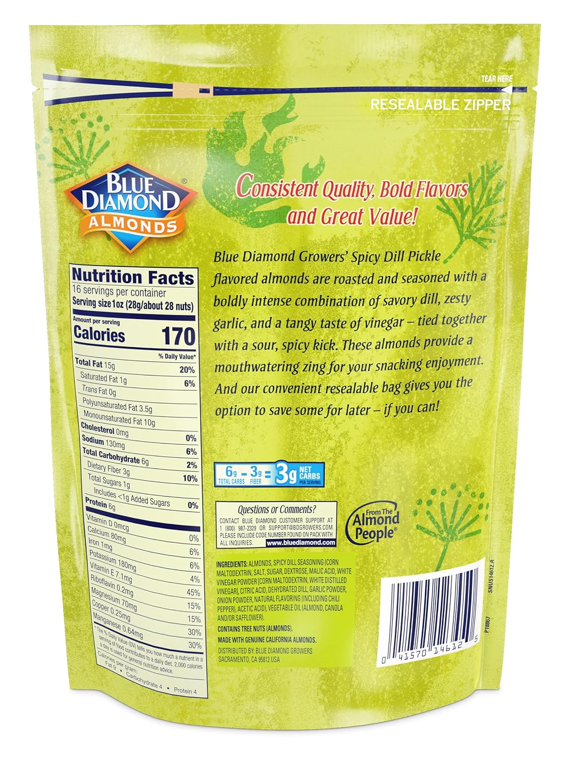 About this item Contains one 16-ounce bag of Blue Diamond bold spicy dill pickle almonds A bold new flavor of savory dill, zesty vinegar, and a spicy kick all wrapped around a satisfyingly crunch almond Low in carbs and high in protein Resealable container makes this a perfect travel snack for adults and children on the way to the office, school, or just on the go Free of cholesterol and trans fat and an excellent source of Vitamin E › See more product details,Contains one 16-ounce bag of Blue Diamond bold spicy dill pickle almonds,A bold new flavor of savory dill, zesty vinegar, and a spicy kick all wrapped around a satisfyingly crunch almond,Low in carbs and high in protein,Resealable container makes this a perfect travel snack for adults and children on the way to the office, school, or just on the go,Free of cholesterol and trans fat and an excellent source of Vitamin E