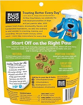 Since 1998, Blue Dog Bakery Has Baked Up Premium Treats With 100% Pure And Natural Ingredients. Treats Made With The Highest Quality Ingredients To Ensure They Are Safe, Wholesome And Downright Yummy! Treats Are Made With Real Eggs And Nonfat Milk, Which Make Them Low Fat And Easy To Digest.Perfect Trainers Are All Natural, Soft And Chewy Treats. They Are Bite-Sized And Ideal For Training - Or For Any Dog Looking For A Little Nibble. Perfect Trainers Are Made Without Any Corn, Wheat Or Soy, And They Make Learning New Tricks A Breeze! Packed With A Resealable Zipper To Ensure Continued Freshness. Our Treats Are The Perfect Addition To Dog Food That Keeps Your Pup Happy And Healthy. We Remember Walking Through The Grocery Aisle Dismayed By The Lack Of Healthy Treat Alternatives. We Were Determined To Find A Way To Treat Better, And The First Step In That Was Obtaining Premium Ingredients. That Simple Thought—Fresh-Baked, Healthy, And Delicious Treats—Is What Drove Us To Start Blue Dog Bakery In 1998. Ten Years Later, We Were The First All-Natural, Premium, And Low Fat Dog Treat Option To Be Nationally Distributed Wherever You Buy Groceries. Although Our Treats Are Made For Dogs, We Source Only Human-Grade Ingredients For All Of Our Treats. While We Trust Our Office Dogs’ Tail Wags As Positive Indicators Of Good Taste, We Also Personally Taste-Test All Of Our Products Before They Go To Market