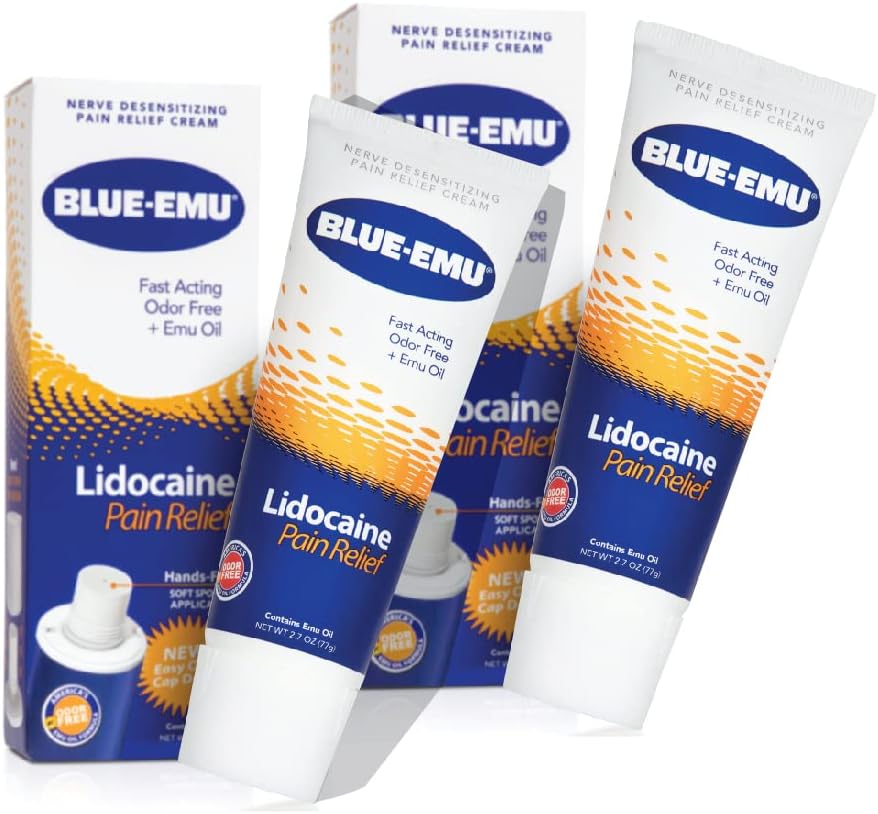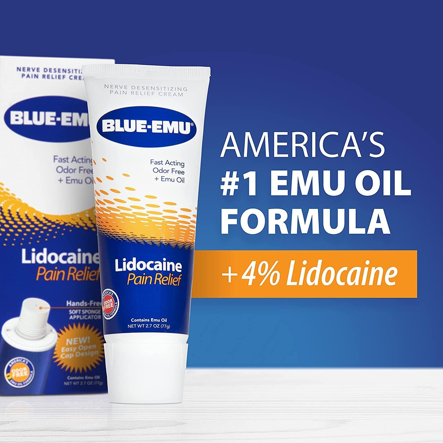 Blue-Emu is the go to brand for America's #1 Emu Oil Formula. The naturally powerful carrier oil allows ingredients such as Aloe Vera absorb directly to your tired joints and musclesMultiple use application! Apply to back, neck, shoulders, elbows, wrists, knees, hips, feet, hands, and ankles for pain relief assistanceHands free application! This is the only patented hands free sponge top applicator available for lidocaine creams. Hands will not be numb after application as they would with other products in the marketThe odor free, deep penetrating cream gets below the skin in a hurry, no need to wait long periods of time for the soothing formula to kick inBlue-Emu Lidocaine Numbing Pain Relief contains 4% lidocaine which assists in desensitizing aggravated nerves and targets pain relief in a centralized wayBlue Emu Lidocaine Numbing Cream Pain Relief, 2.7 oz (2 Pack)