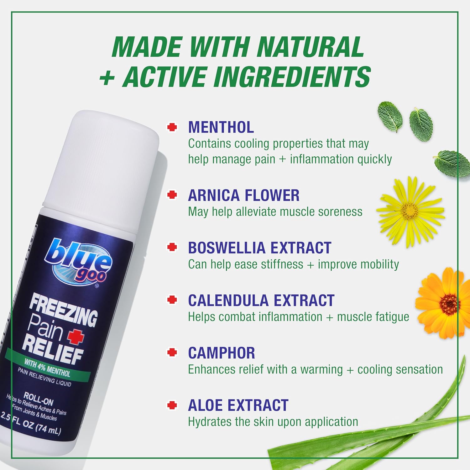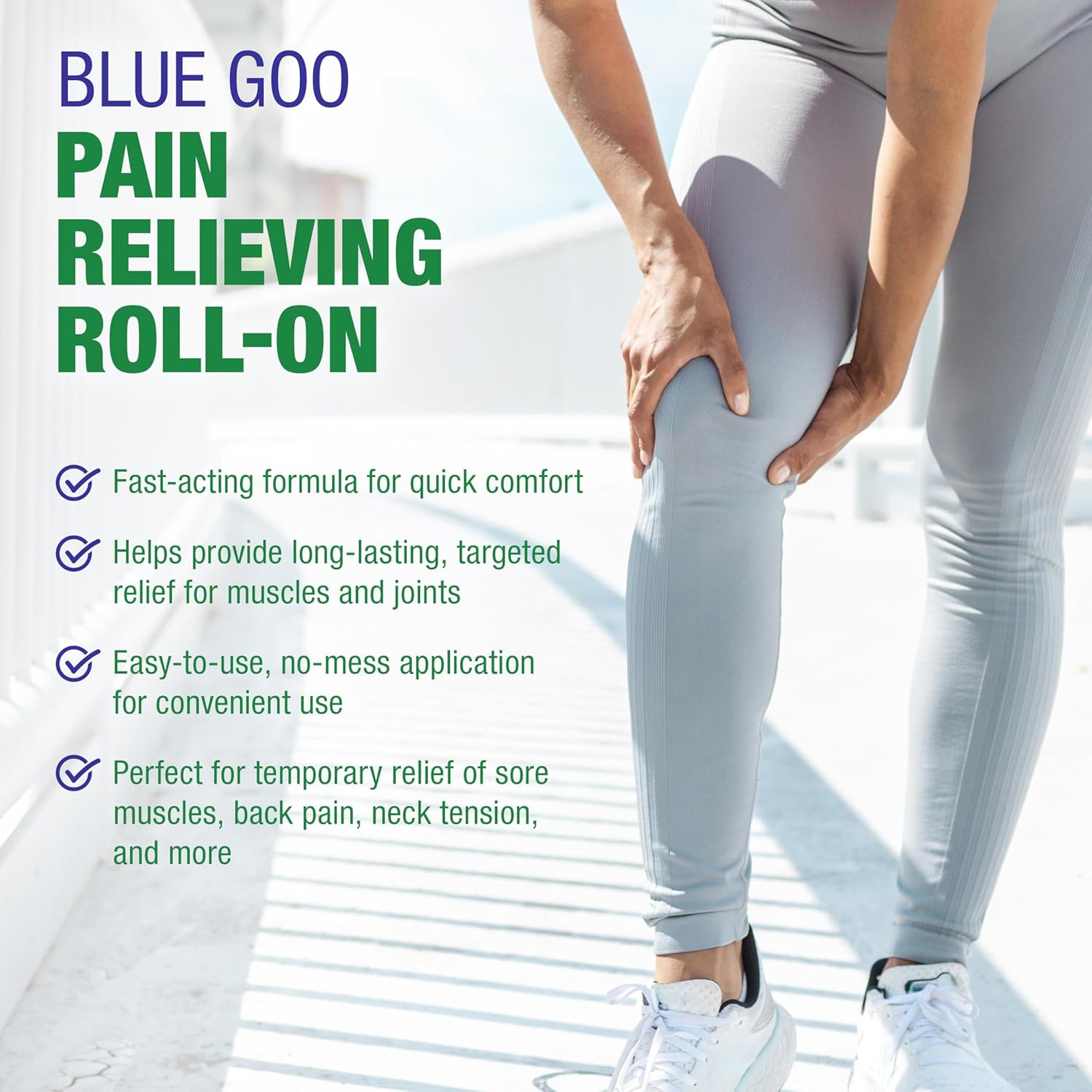 Blue Goo Pain Relieving Menthol Roll On - For Back, Neck, Muscle & Joint Pain, Sprains, Strains - Fast-Acting, Soothing, Cooling Pain Relief Liquid, W/4% Menthol - 2.5 Oz (1 Pack)