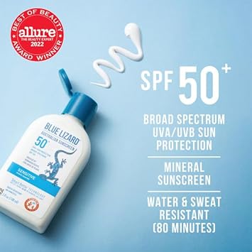 Blue Lizard Australian Sunscreen'S Sensitive Mineral Sunscreen With Spf 50+ Protects Your Skin With Blue LizardâS Strongest Uv Protection Yet. With 80 Minutes Of Sweat And Water Resistance, You Stay Protected Longer While Swimming, During Your Run Or Whatever You Love To Do. This Mineral Formula Uses Zinc Oxide And Titanium Dioxide To Protect Your Skin From Harmful Uva And Uvb Rays Without The Use Of Potentially Irritating Chemical Active Ingredients. We Love The Reef! To Help Protect Fragile Reef Ecosystems, Blue Lizard Sensitive Sunscreens Contain No Oxybenzone Or Octinoxate