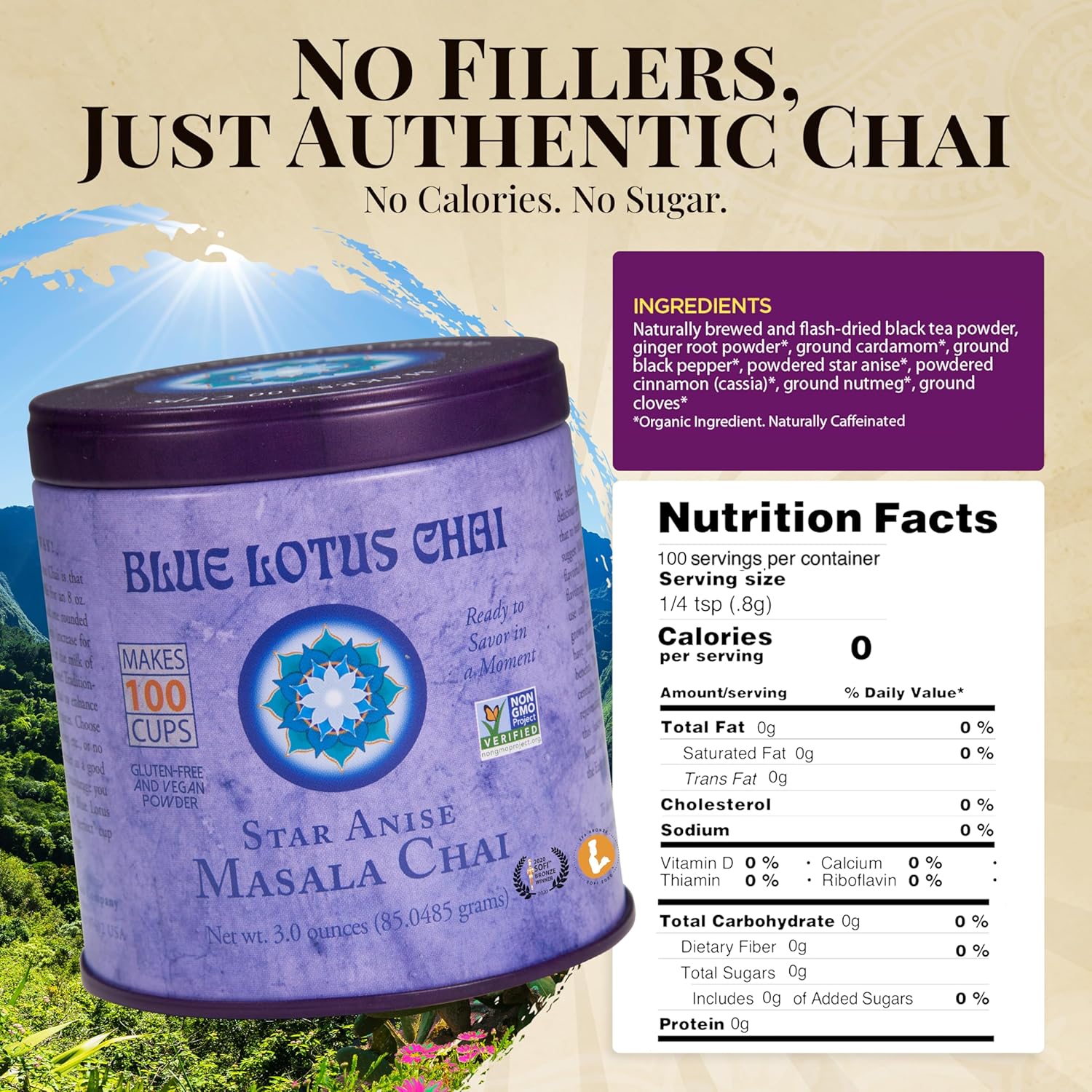 Blue Lotus Chai - Star Anise Masala Chai - Makes 100 Cups - 3 Ounce Masala Spiced Chai Powder With Organic Spices - Instant Indian Tea No Steeping - No Gluten
