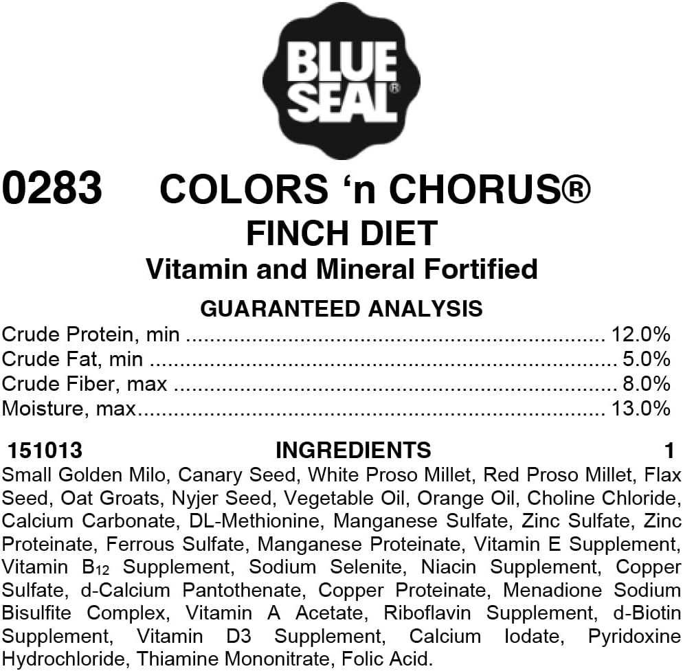 Finch Bird SeedBlue Seal Colors ‘n Chorus Finch Diet is formulated with premium seeds and ingredients to provide your birds with a nutritious and tasty diet. Vitamin and mineral fortification is added to support a "lifetime of health." Colors ‘n Chorus is further enhanced with the refreshing aroma of orange oil