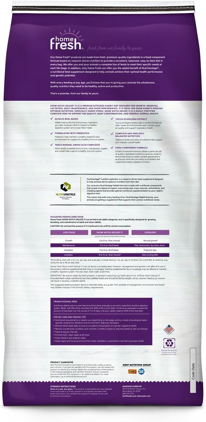 Extruded Nuggets: Home Fresh Show Hutch 17 Improves Digestibility And Nutrient Utilization. Extruded Nuggets Slow The Rate Of Feed Intake And Reduces Fines, For Fewer Digestive And Respiratory Issues10Essential Nutrition: Kent Nutrition Blue Seal Home Fresh Show Hutch 17 Bunny Food Promotes A Solid Nutritional Balance For Your Rabbit'S Growth And Essential Development10Prebiotics: Blue Seal Home Fresh Top Hutch 17 Complete Rabbit Food'S Proven Formula Created By Our Expert Nutrition Team Supports A Healthy Digestive Tract And Immune System10Chelated Trace Minerals: The Greater Absorption And Utilization Of Zinc, Copper, And Manganese Helps To Promote Optimum Bone, Muscle, And Tissue Confirmation In Show Rabbits10Complete And Balanced Diet: Home Fresh Show Hutch 17 Bunny Food Provides Complete Daily Nutrition And Requires No Additional Supplements For Your Rabbit'S Health10