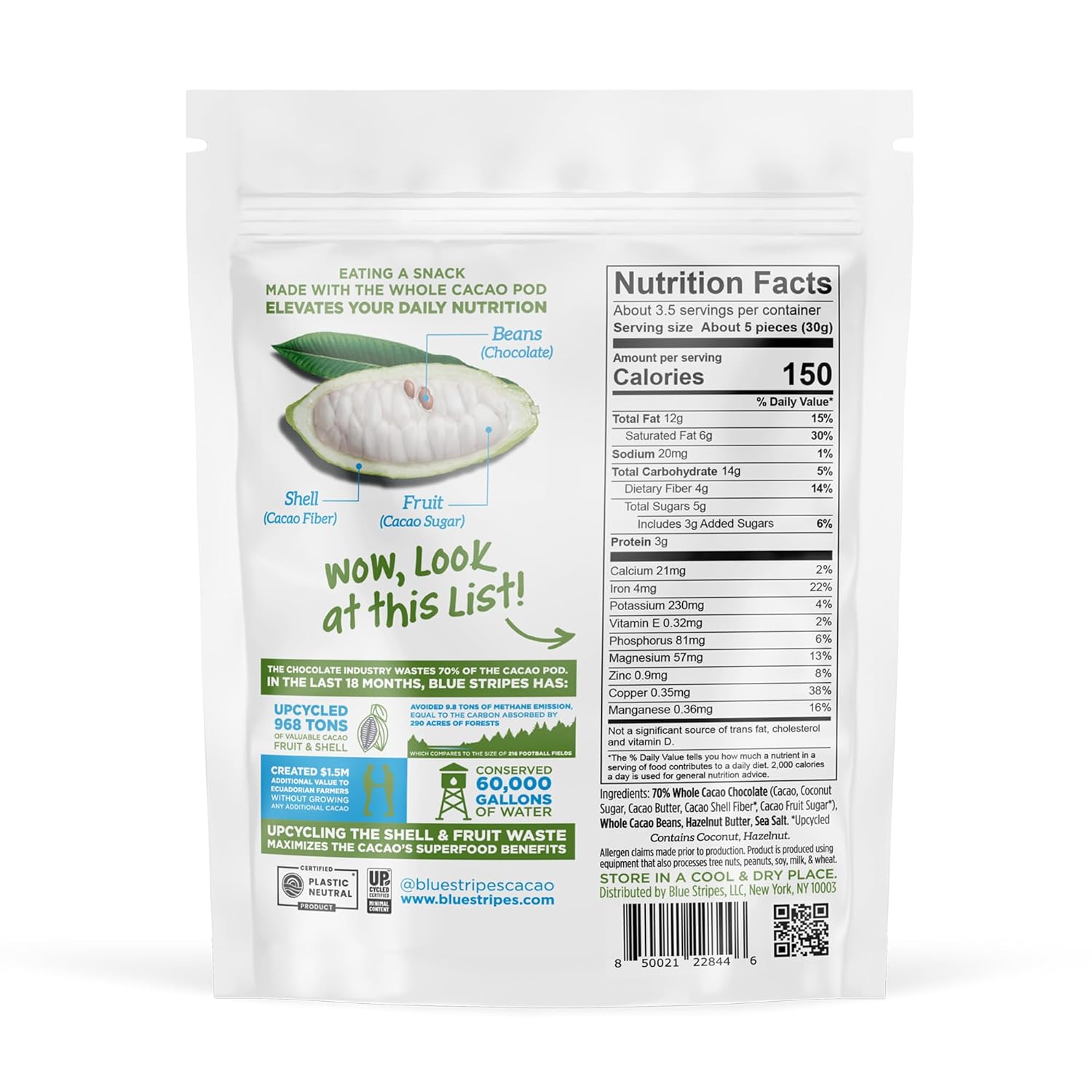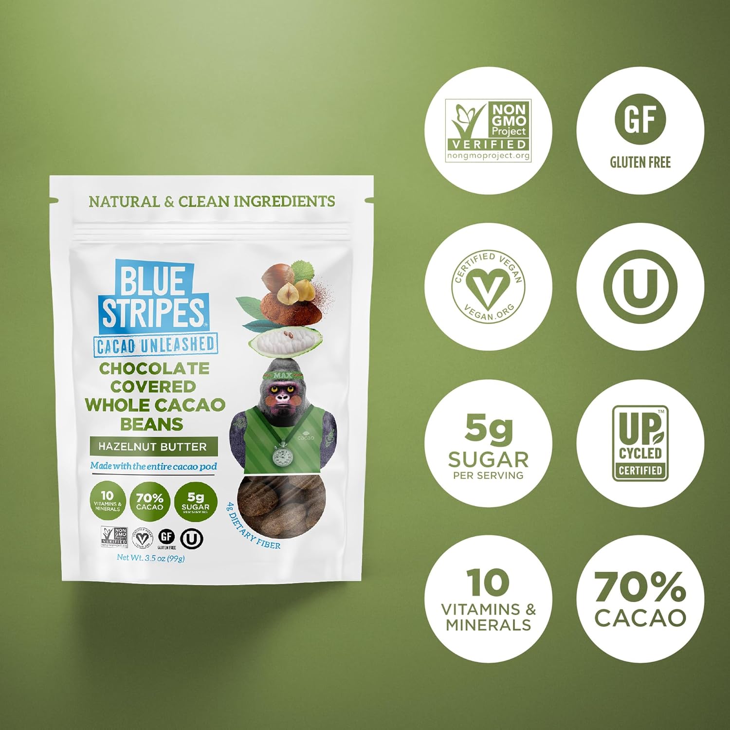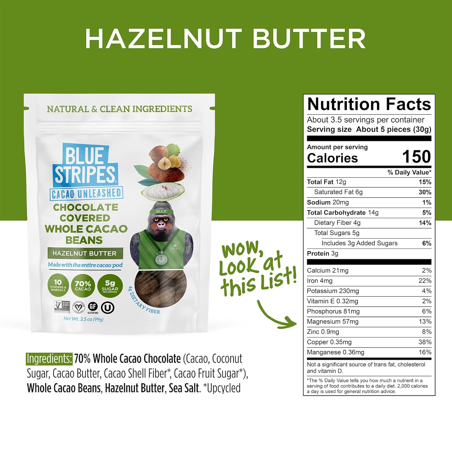 Blue Stripes Hazelnut Butter Chocolate Covered Whole Cacao Beans, 3.5 Oz