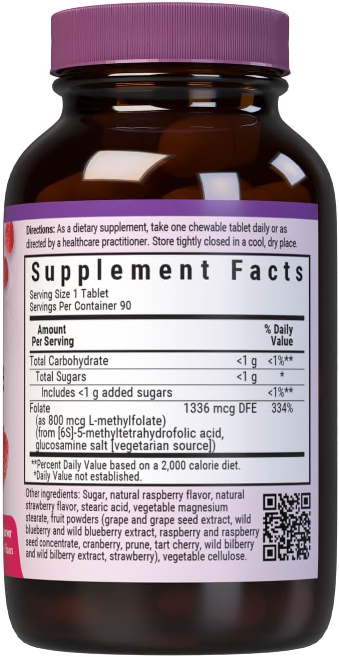 Bluebonnet Earthsweet Methylfolate 800 Mcg Cellular Active Coenzyme 5-Mthf L Methyl Folate Supplement - Prenatal & Energy Support* - Non-Gmo, Vegan, Gluten-Free - Raspberry - 90 Chewable Tablets