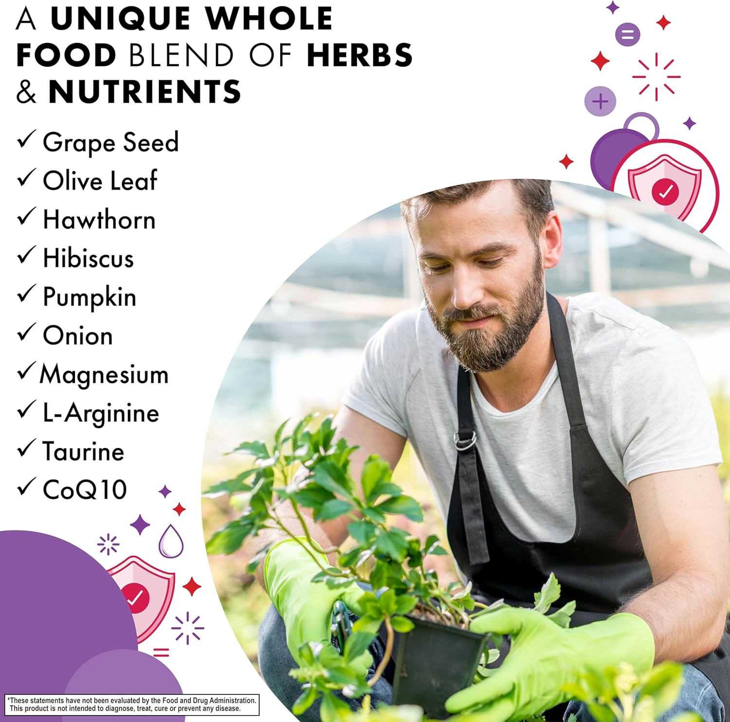 About this item INGREDIENTS FROM NATURE - Made with a unique blend of sustainably harvested or wild crafted herbal and botanical extracts hawthorn flower, onion and pumpkin, hibiscus and olive, free-form amino acids, arginine and taurine, plus grape seed extract and CoQ10. HIGHLY ABSORBABLE FORMULA - Targeted nutrients are delivered in a convenient, easy-to-swallow vegetable capsule for maximum assimilation, utilization and absorption. CLEAN NUTRITION - This product is gluten-free, Non-GMO and vegan and is free of dairy, egg, fish, crustacean shellfish, tree nuts, peanuts, wheat, soybeans, sesame, barley, sodium, and sugar. ONLY THE BEST INGREDIENTS - Made with exceptional raw materials to produce premium-quality, superior-purity supplements for maximum bioavailability and absorption to help achieve the desired health benefits. Each ingredient in our formulas has undergone tests to verify that they are free of microbes, pollutants, pesticides and heavy metals. Our supplements are subjected to stringent examinations for potency, uniformity, disintegration and dissolution. ECO-FRIENDLY PRODUCTS - We work directly with growers, farmers and suppliers to ensure you and your family will get the best whole food ingredients possible. Made without artificially derived colors, flavors or sweeteners and unnecessary binders, fillers or additives to maintain nutrient integrity. Delivered in recyclable packaging and packaged with eco-friendly recycled cardboard boxes using vegetable-based inks. › See more product details,INGREDIENTS FROM NATURE - Made with a unique blend of sustainably harvested or wild crafted herbal and botanical extracts hawthorn flower, onion and pumpkin, hibiscus and olive, free-form amino acids, arginine and taurine, plus grape seed extract and CoQ10,HIGHLY ABSORBABLE FORMULA - Targeted nutrients are delivered in a convenient, easy-to-swallow vegetable capsule for maximum assimilation, utilization and absorption,CLEAN NUTRITION - This product is gluten-free, Non-GMO and vegan and is free of dairy, egg, fish, crustacean shellfish, tree nuts, peanuts, wheat, soybeans, sesame, barley, sodium, and sugar,ONLY THE BEST INGREDIENTS - Made with exceptional raw materials to produce premium-quality, superior-purity supplements for maximum bioavailability and absorption to help achieve the desired health benefits. Each ingredient in our formulas has undergone tests to verify that they are free of microbes, pollutants, pesticides and heavy metals. Our supplements are subjected to stringent examinations for potency, uniformity, disintegration and dissolution,ECO-FRIENDLY PRODUCTS - We work directly with growers, farmers and suppliers to ensure you and your family will get the best whole food ingredients possible. Made without artificially derived colors, flavors or sweeteners and unnecessary binders, fillers or additives to maintain nutrient integrity. Delivered in recyclable packaging and packaged with eco-friendly recycled cardboard boxes using vegetable-based inks