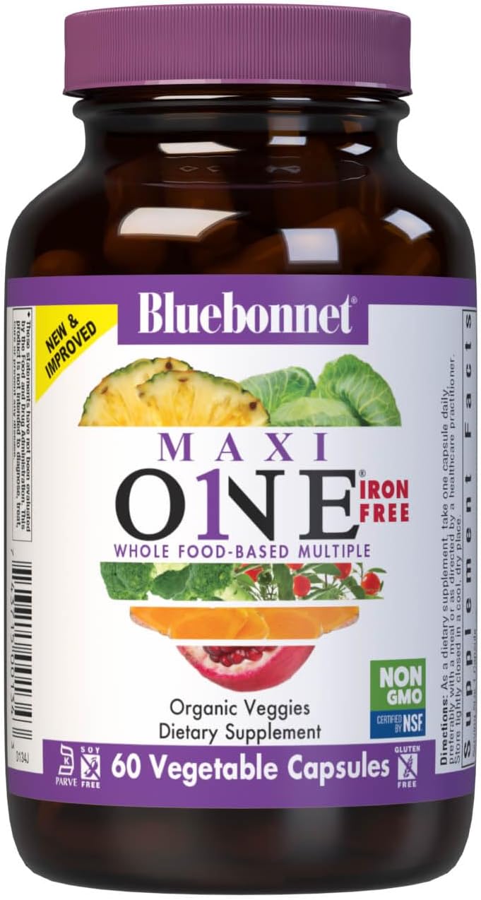 Bluebonnet Nutrition Maxi One (Iron-Free), Whole Food Multiple, Enzymes, Energy, Vitality, Gluten-Free, Kosher, Dairy-Free, Vegetarian Friendly, Soy-Free, Non-Gmo, 60 Vegetable Capsule, 2 Month Supply