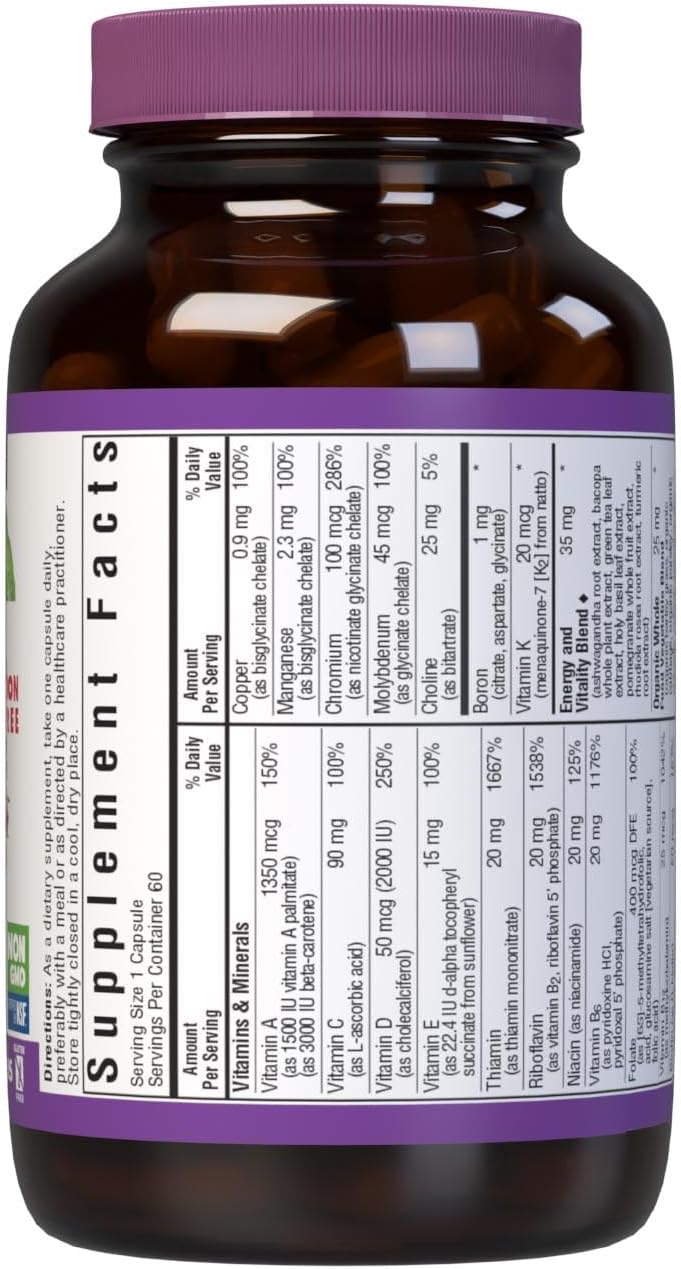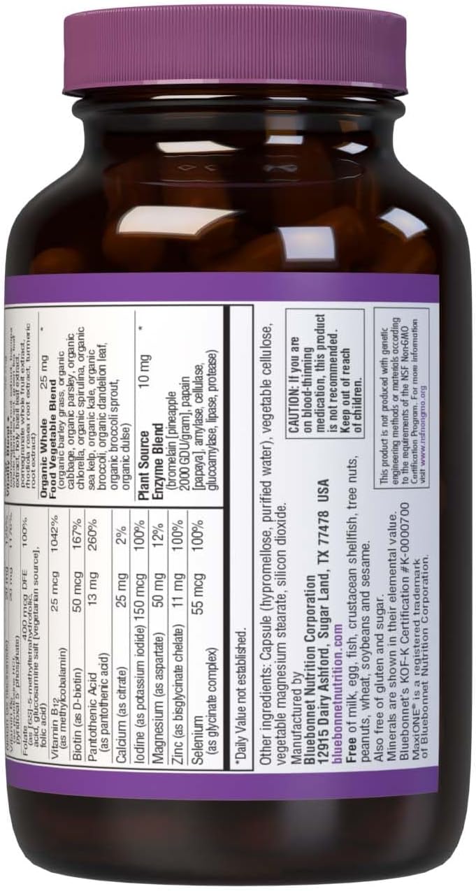 Bluebonnet Maxi One Vegetable Capsules is formulated with coenzyme B-vitamins, natto-sourced K2, organic veggies, plant-sourced digestive enzymes, and an herbal blend for energy and vitality. ?,Single Daily Multiple with B Complex & Albion Chelated Minerals,Daily Health & Wellbeing ?,60 Vegetable Capsules, 60 Servings,Iron-Free, Gluten-Free, Kosher Certified, Dairy-Free, Vegetarian Friendly, NSF Non-GMO Certified, Soy-Free,Free of milk, egg, fish, crustacean shellfish, tree nuts, peanuts, wheat, soybeans and sesame. Also free of gluten and sugar