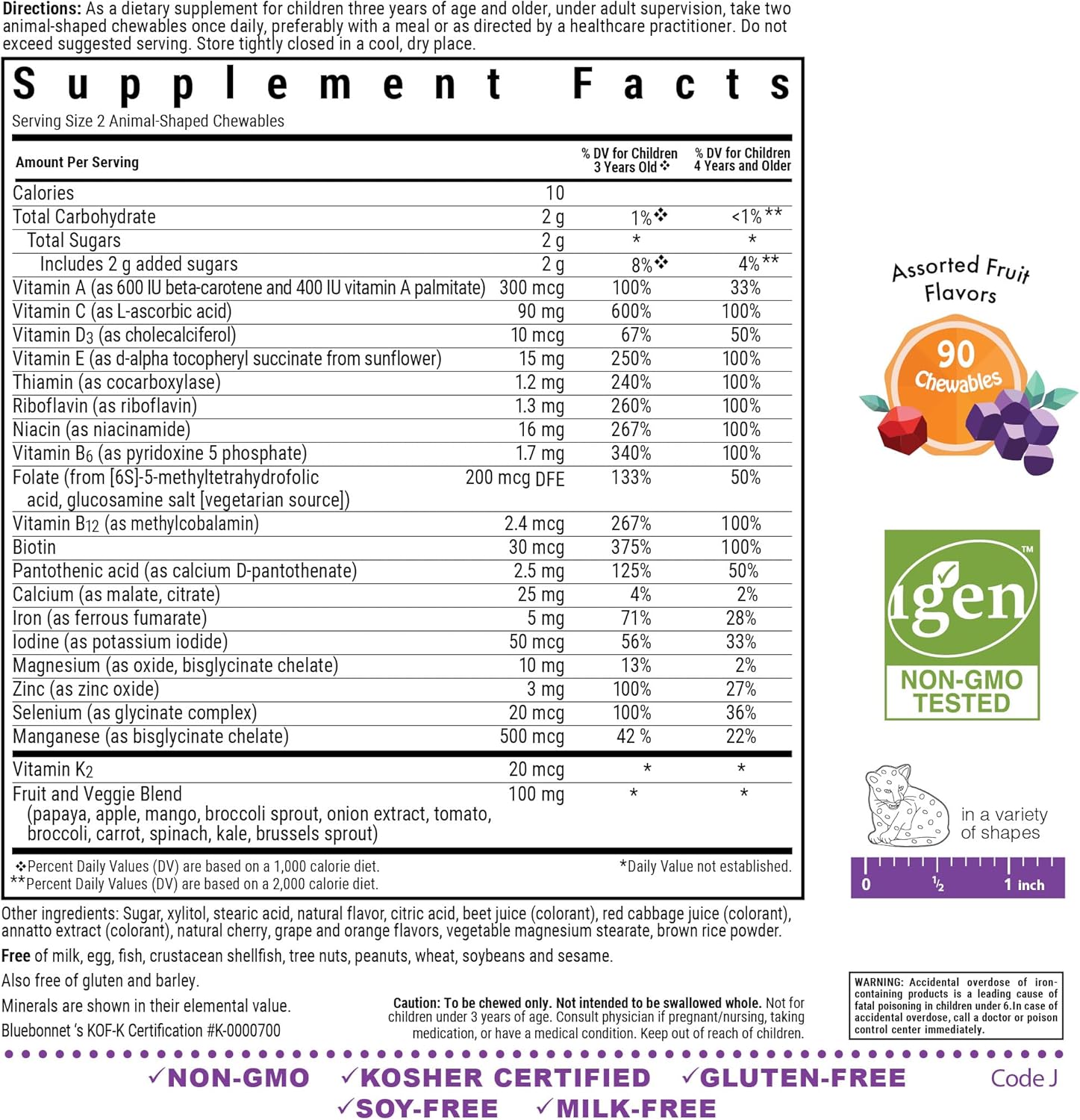 Bluebonnet Nutrition Rainforest Animalz Whole Food Based Multiple Chewable Tablets, Kids Multivitamin & Mineral, Vitamin C, D3, Iron, Gluten Free, Milk Free, Kosher, 90 Chewable Tablets, Mixed Flavors